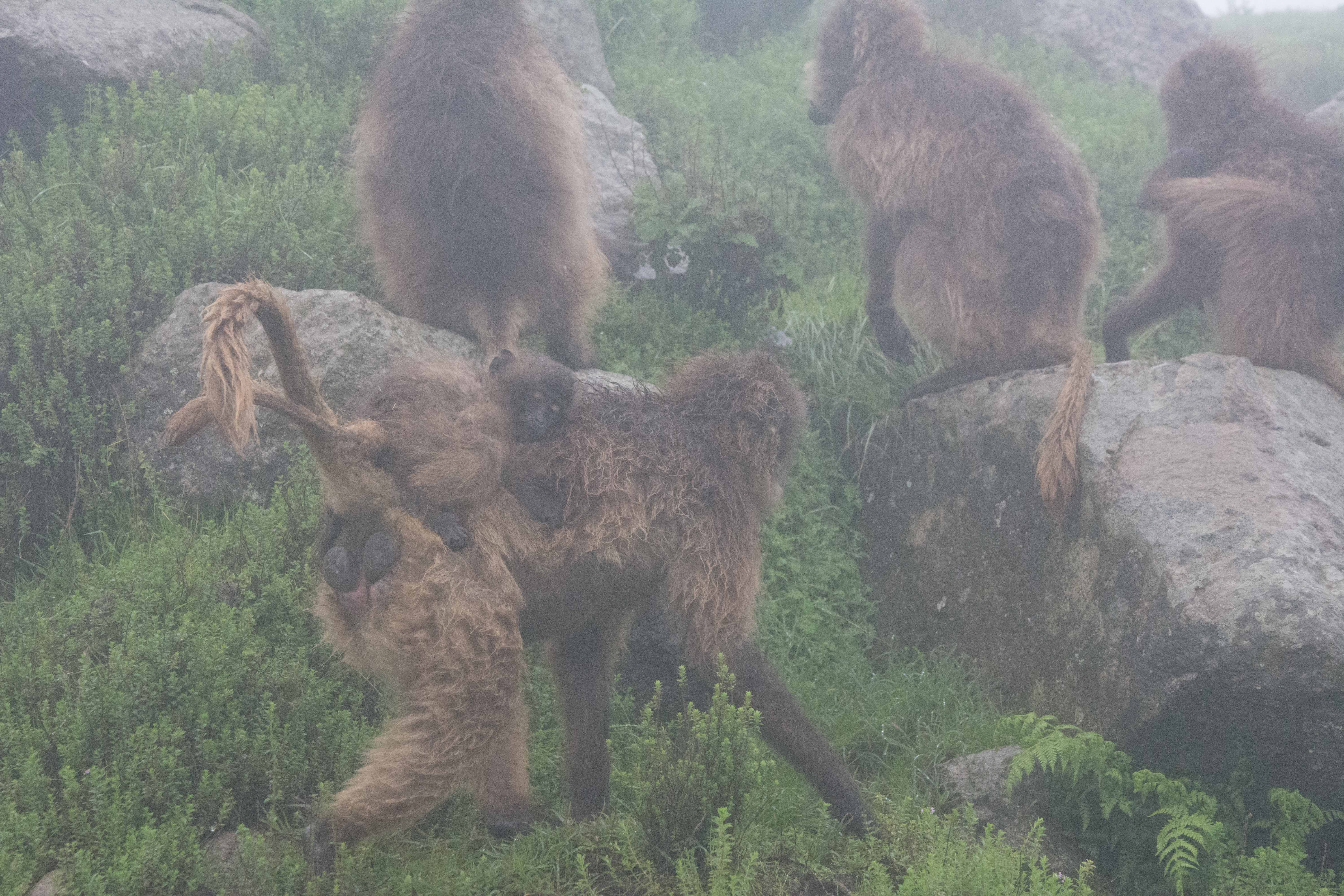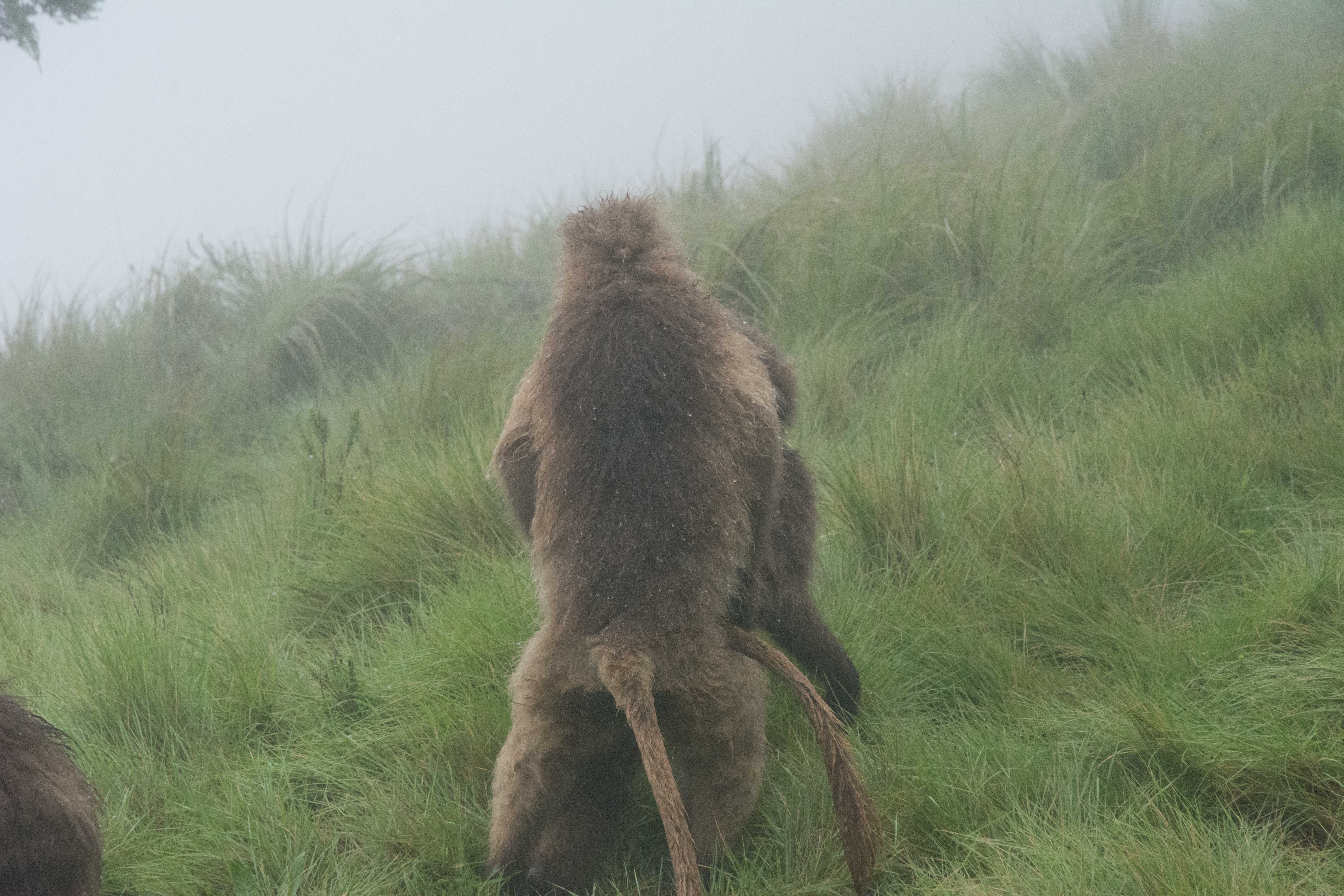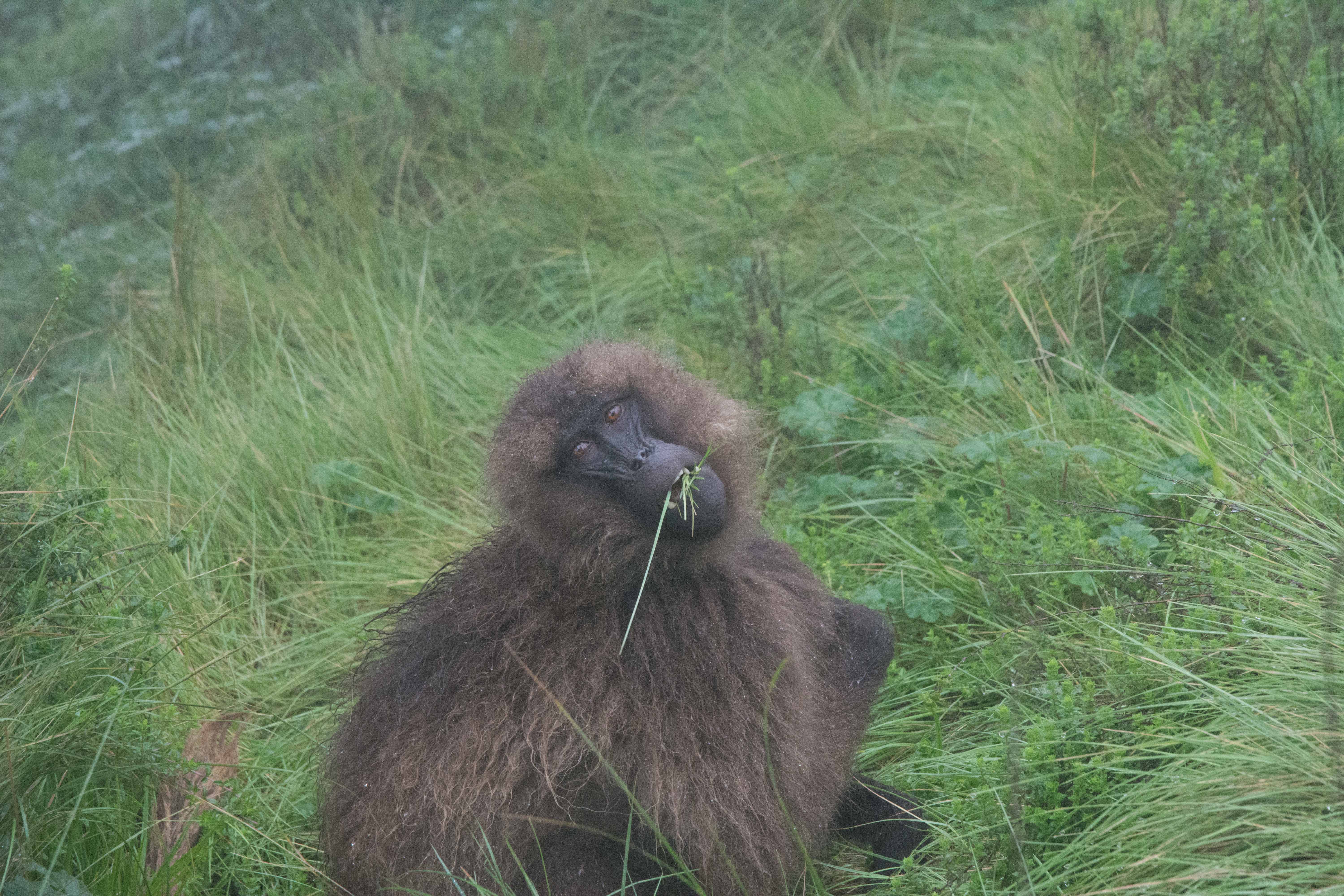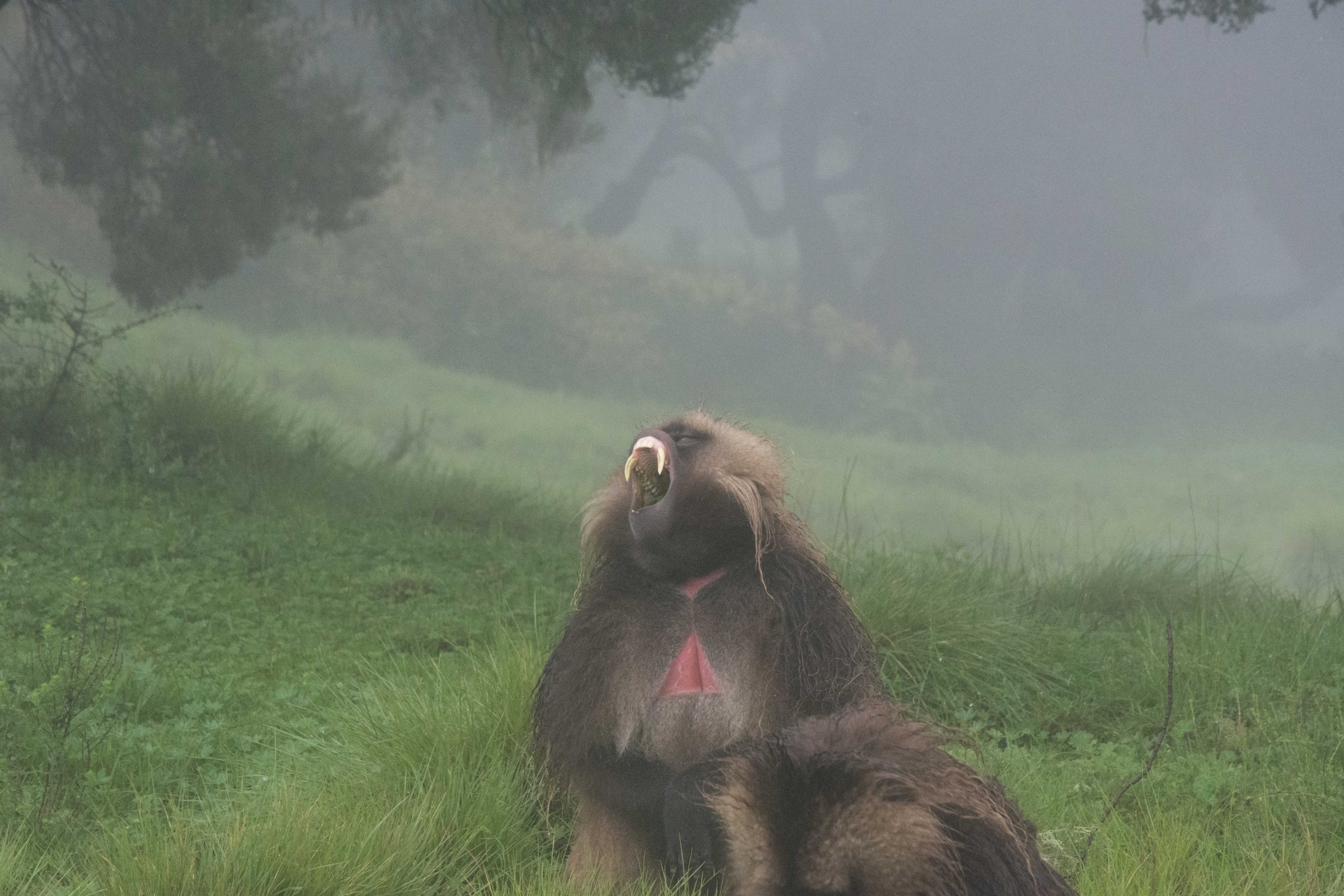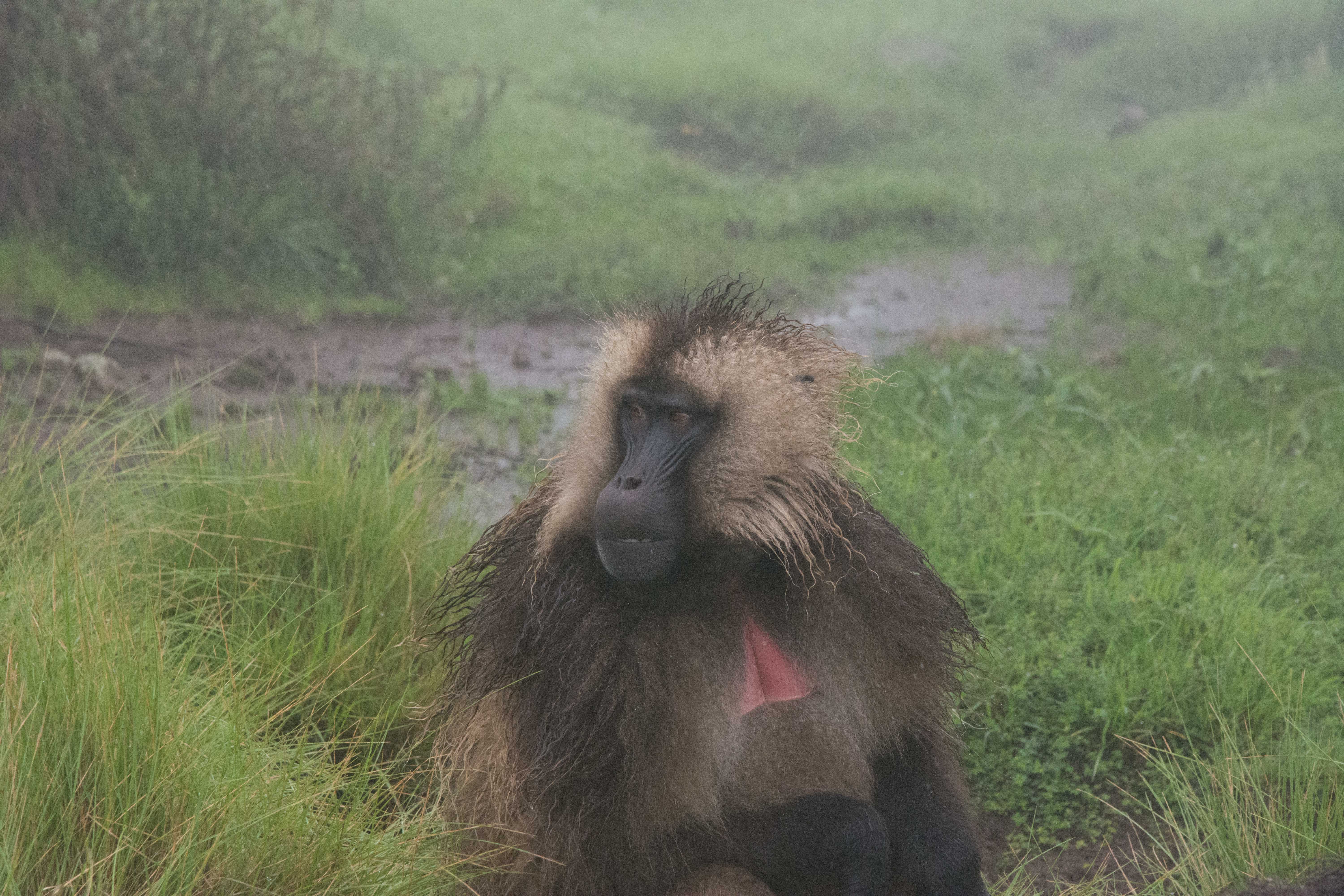 Way up in the Ethiopian Highlands past the famous city of Gondor lies mountains like no other.  The Simien Mountains with its misty fog and rain are some of the biggest mountain ranges on the African Continent.  While I wish the weather was a lot better here, you can never deal with Mother Nature.  While many people come here for the hikes and the beautiful water fall views, I came here to see the famous Gelada Baboons.  These Baboons are found only in a certain part of these mountains and are the last of the grazing baboons left in the world today.  Commonly called the Bleeding Heart Baboons because of the heart on their chest, they have a wide range of facial expressions and vocalizations which are second only to humans.  By day the graze upon the grass of the high mountain plains in troops and by night to stay away from predators they sleep on the rocky cliffs below.  While it rained and was foggy most of the time up here, I did get close enough to see how they function as a troop.  Most of the trekking was done in rain and fog and wind, but when the rain cleared we also got a beautiful look at the stunning scenery of the waterfalls and landscape.  You can see below what I mean….