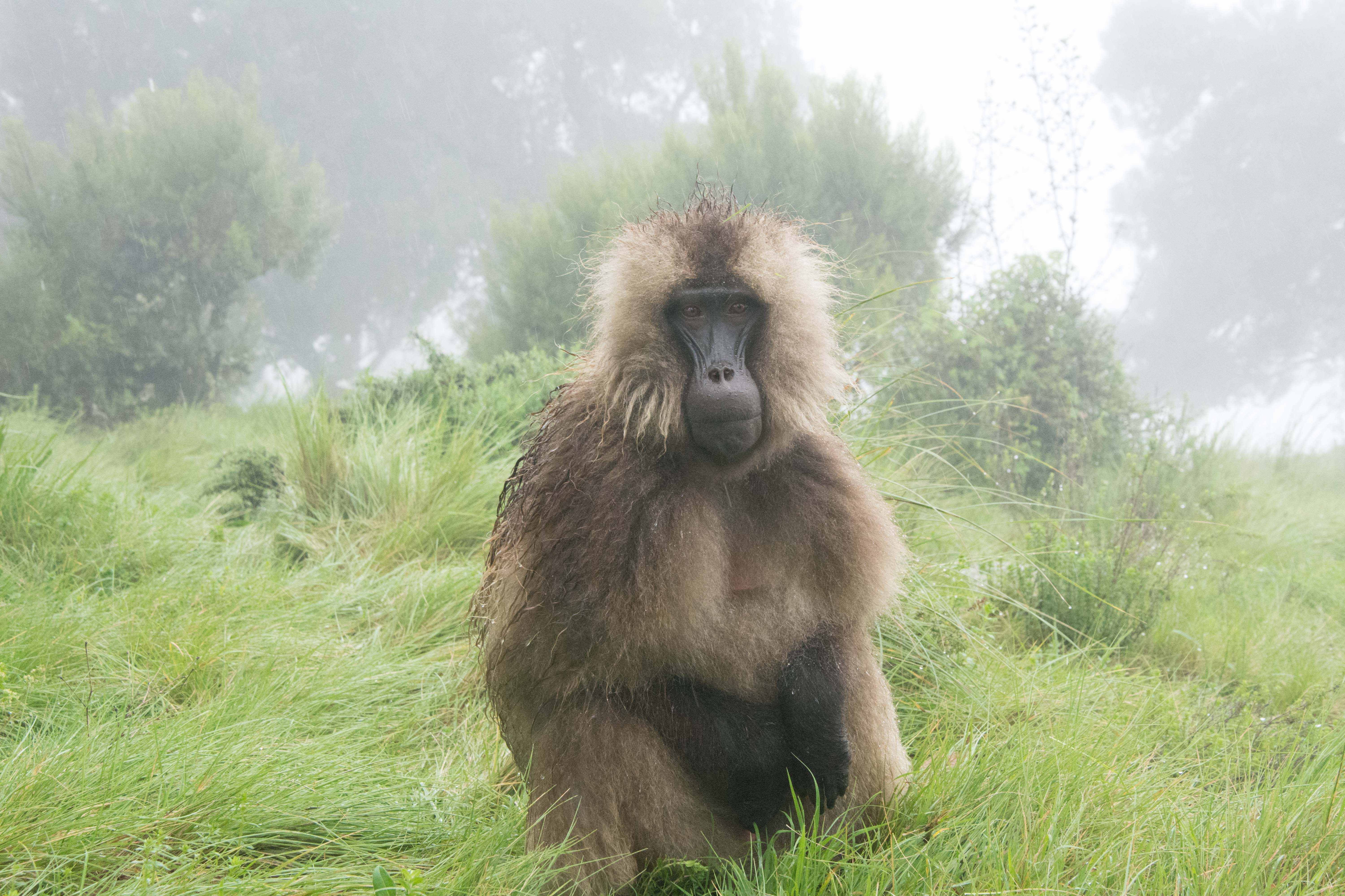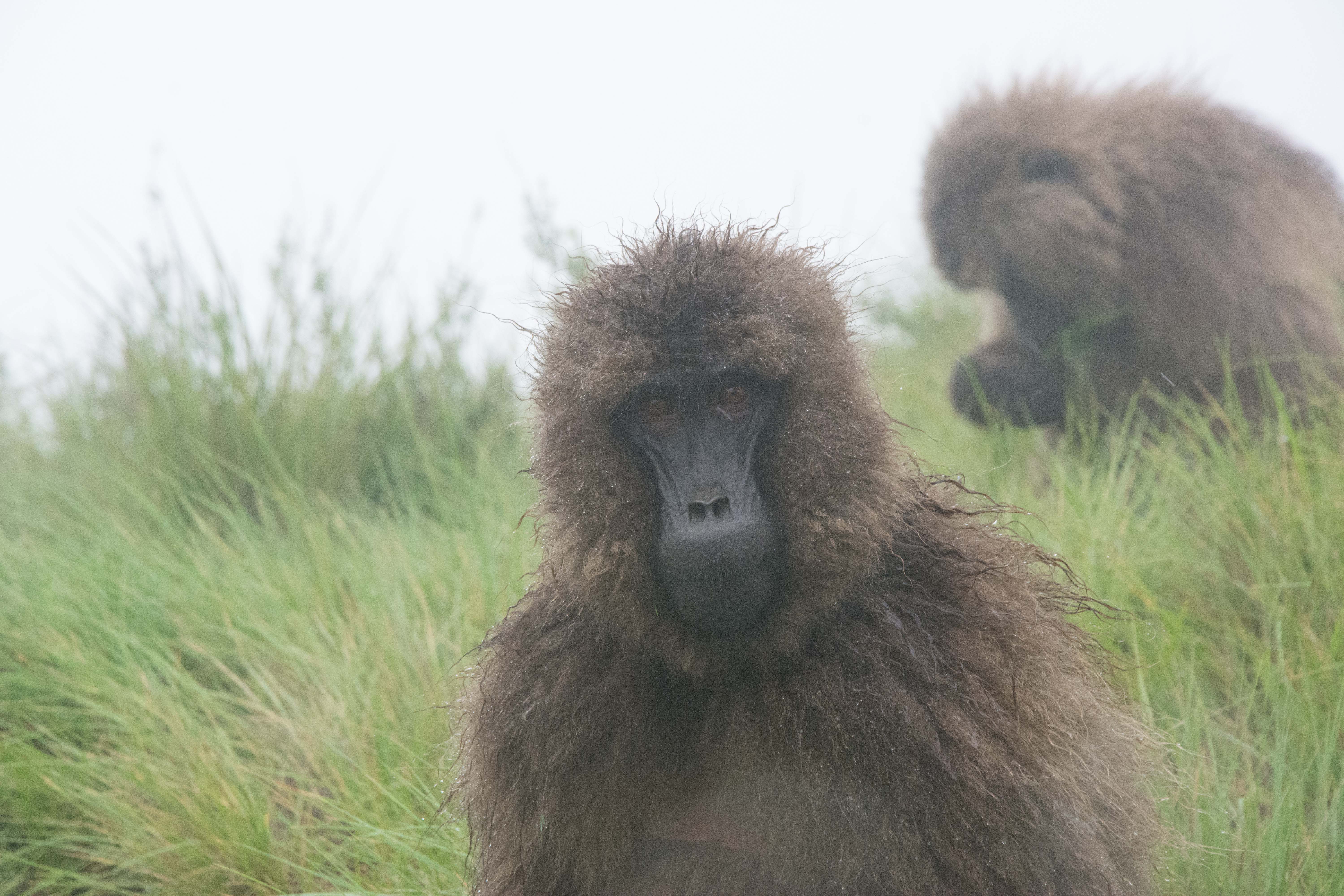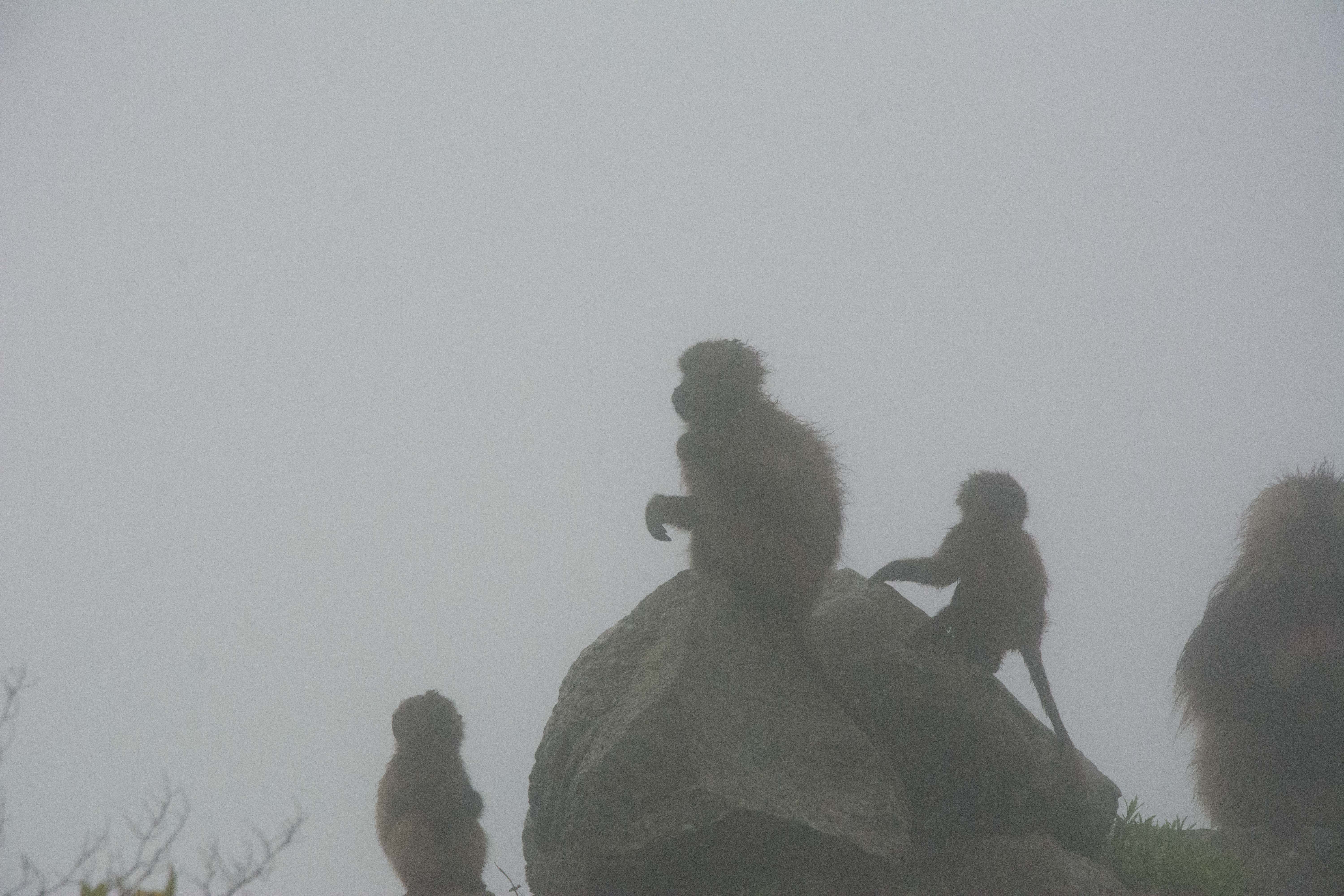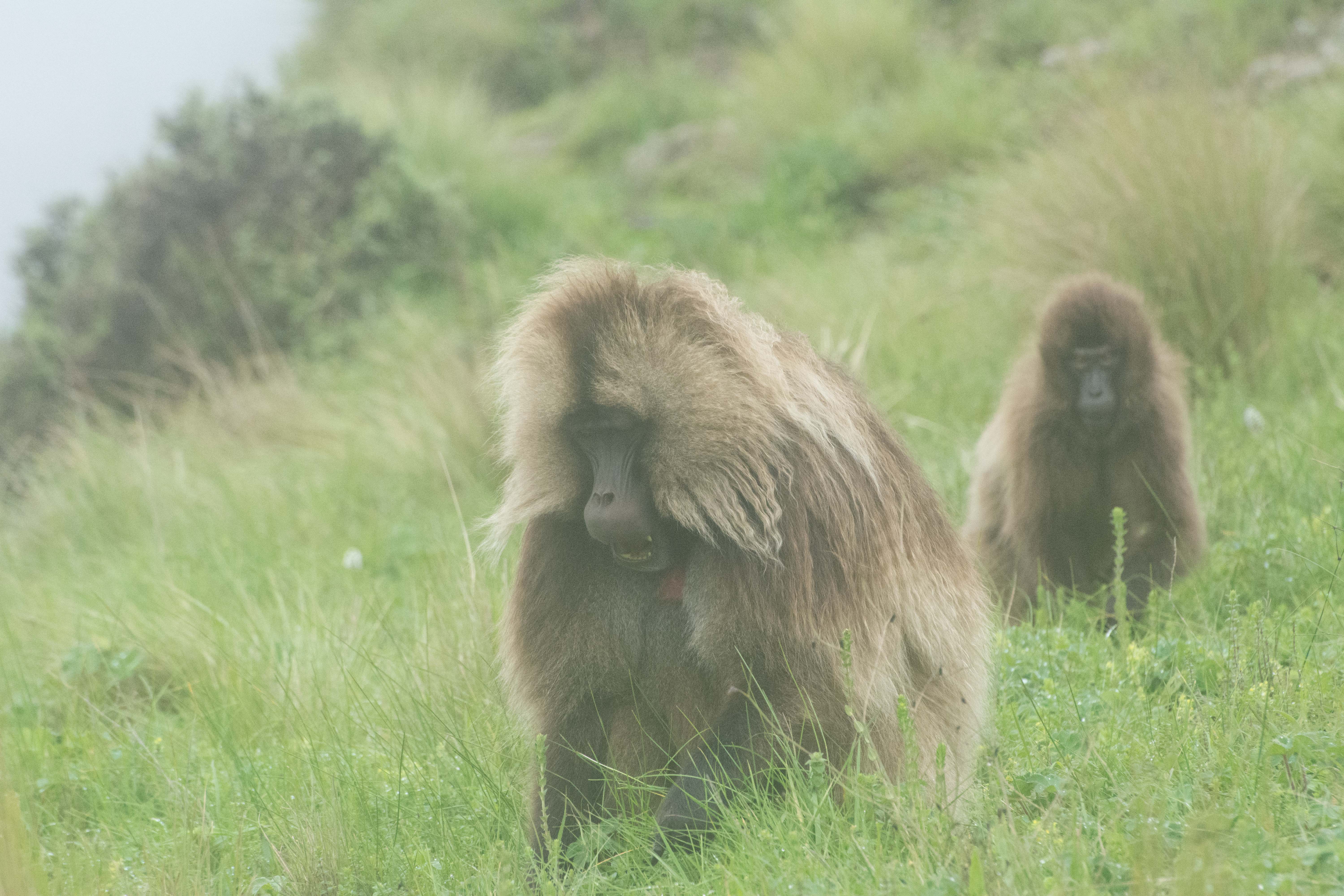 Way up in the Ethiopian Highlands past the famous city of Gondor lies mountains like no other.  The Simien Mountains with its misty fog and rain are some of the biggest mountain ranges on the African Continent.  While I wish the weather was a lot better here, you can never deal with Mother Nature.  While many people come here for the hikes and the beautiful water fall views, I came here to see the famous Gelada Baboons.  These Baboons are found only in a certain part of these mountains and are the last of the grazing baboons left in the world today.  Commonly called the Bleeding Heart Baboons because of the heart on their chest, they have a wide range of facial expressions and vocalizations which are second only to humans.  By day the graze upon the grass of the high mountain plains in troops and by night to stay away from predators they sleep on the rocky cliffs below.  While it rained and was foggy most of the time up here, I did get close enough to see how they function as a troop.  Most of the trekking was done in rain and fog and wind, but when the rain cleared we also got a beautiful look at the stunning scenery of the waterfalls and landscape.  You can see below what I mean….