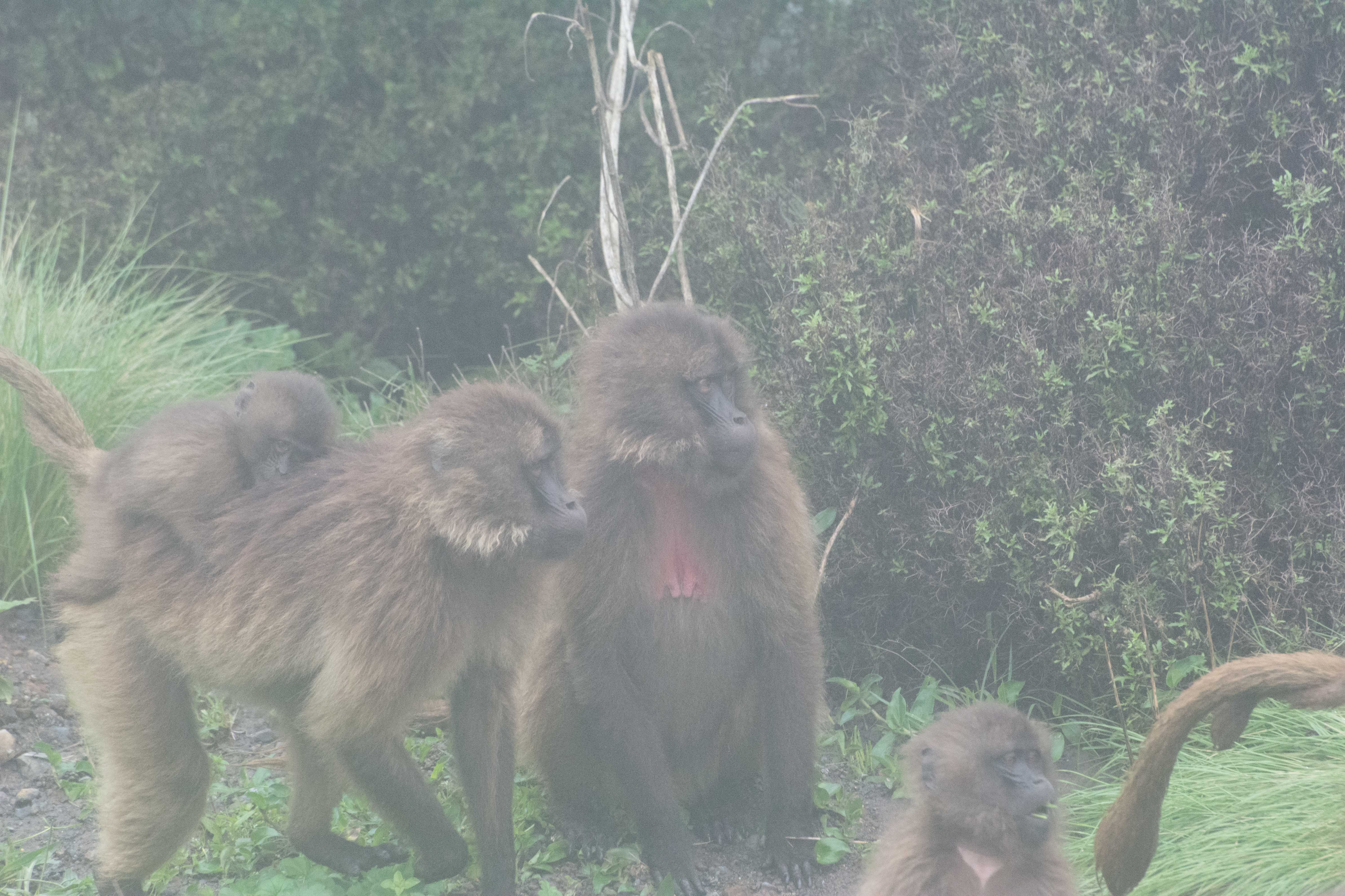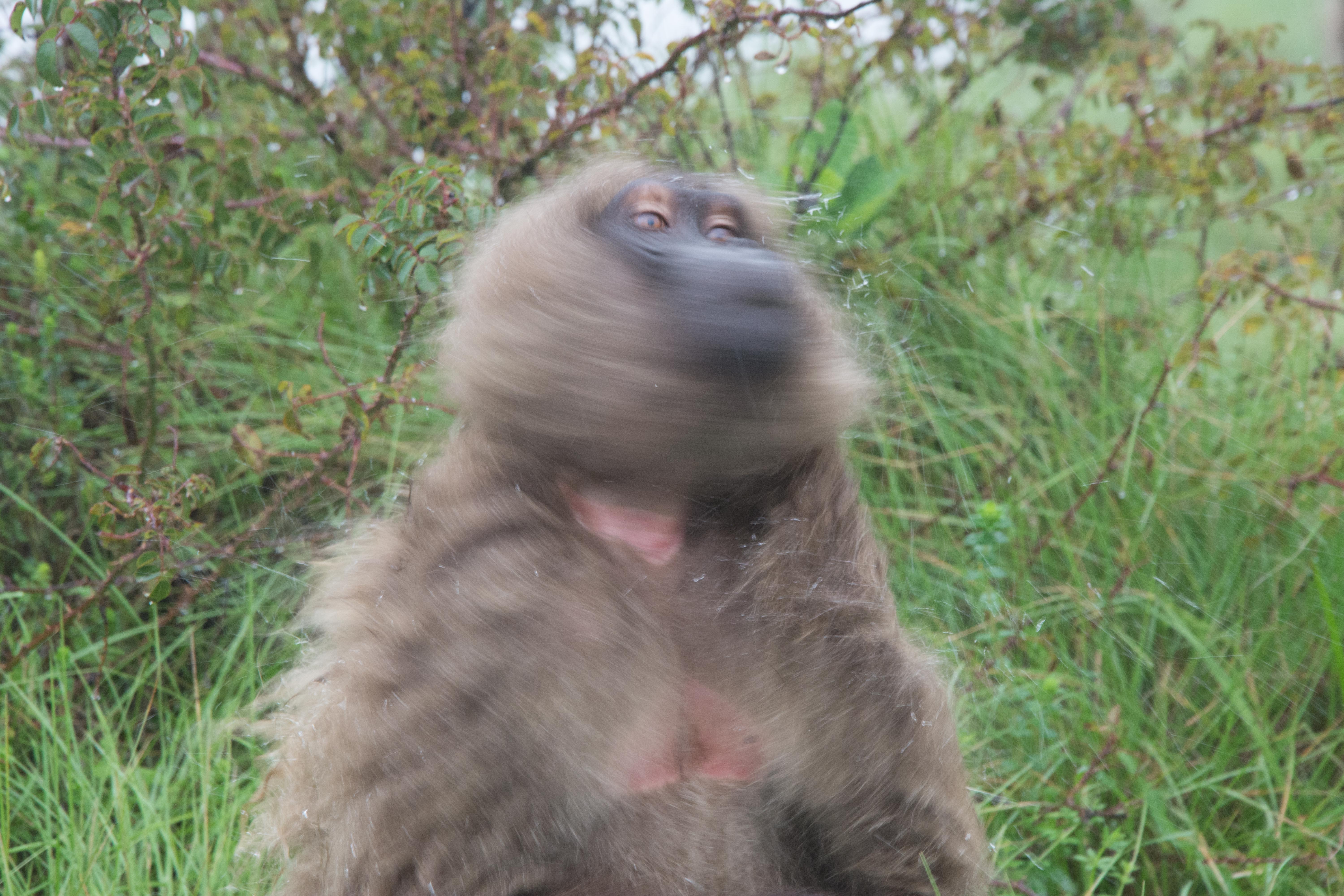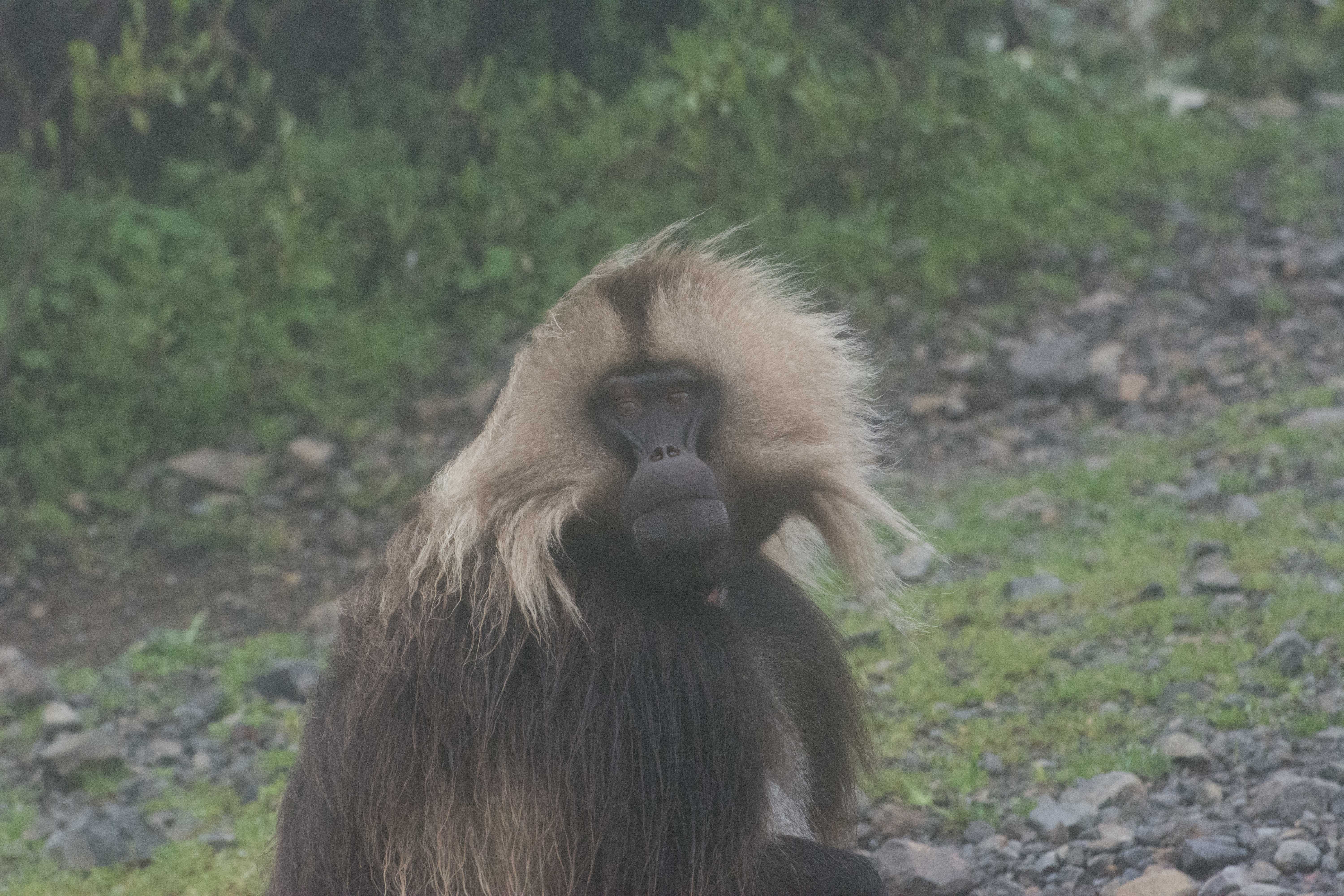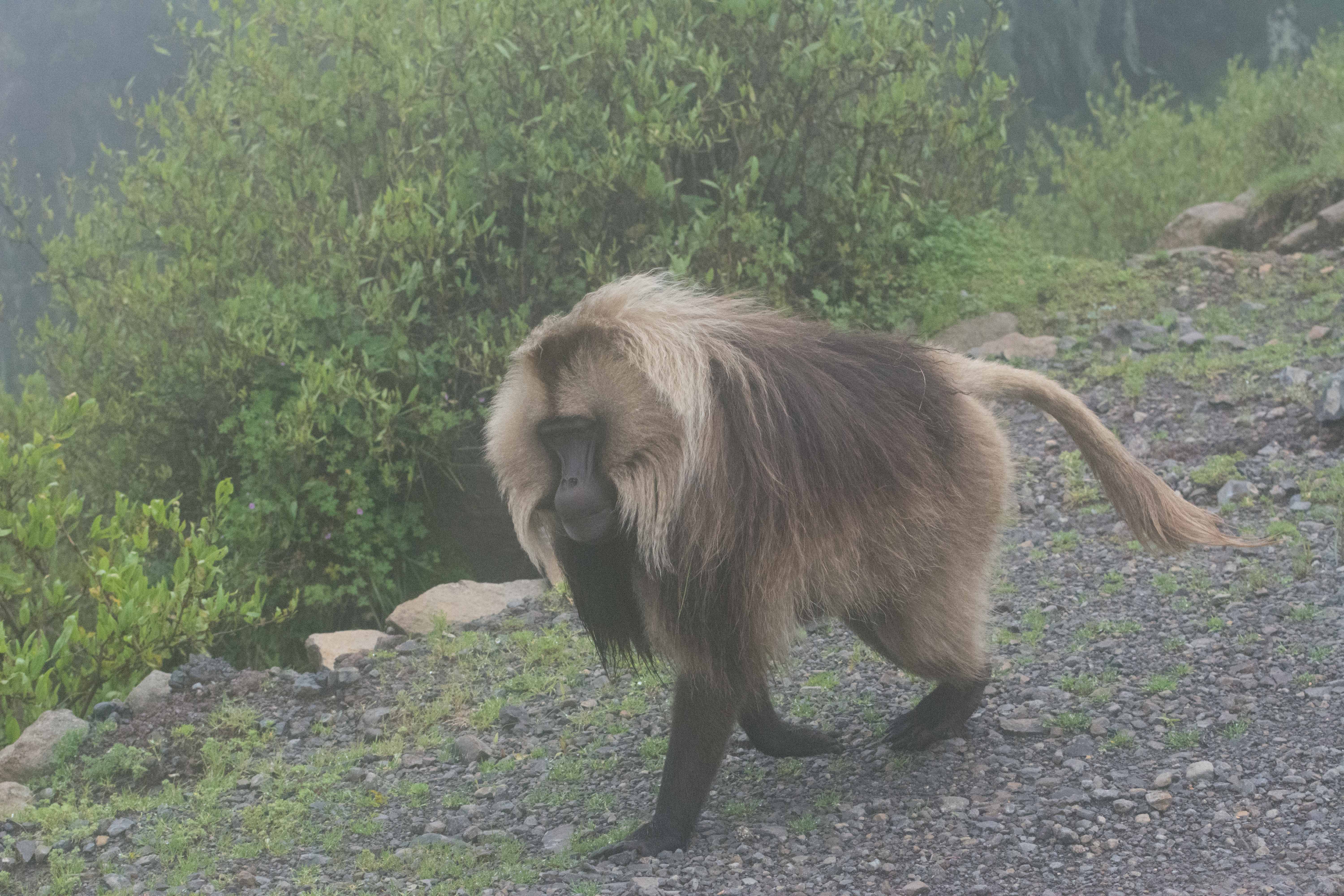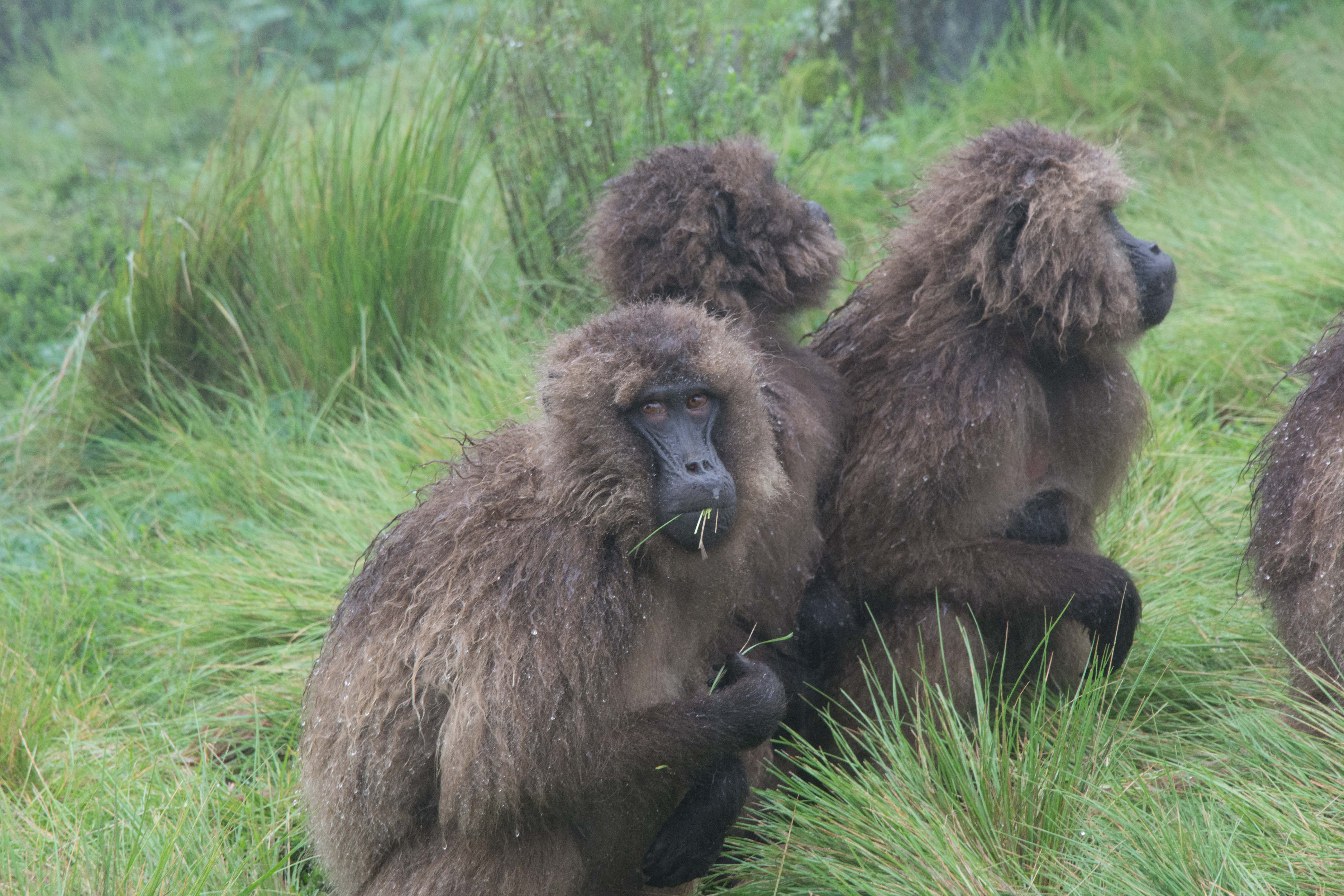 Way up in the Ethiopian Highlands past the famous city of Gondor lies mountains like no other.  The Simien Mountains with its misty fog and rain are some of the biggest mountain ranges on the African Continent.  While I wish the weather was a lot better here, you can never deal with Mother Nature.  While many people come here for the hikes and the beautiful water fall views, I came here to see the famous Gelada Baboons.  These Baboons are found only in a certain part of these mountains and are the last of the grazing baboons left in the world today.  Commonly called the Bleeding Heart Baboons because of the heart on their chest, they have a wide range of facial expressions and vocalizations which are second only to humans.  By day the graze upon the grass of the high mountain plains in troops and by night to stay away from predators they sleep on the rocky cliffs below.  While it rained and was foggy most of the time up here, I did get close enough to see how they function as a troop.  Most of the trekking was done in rain and fog and wind, but when the rain cleared we also got a beautiful look at the stunning scenery of the waterfalls and landscape.  You can see below what I mean….