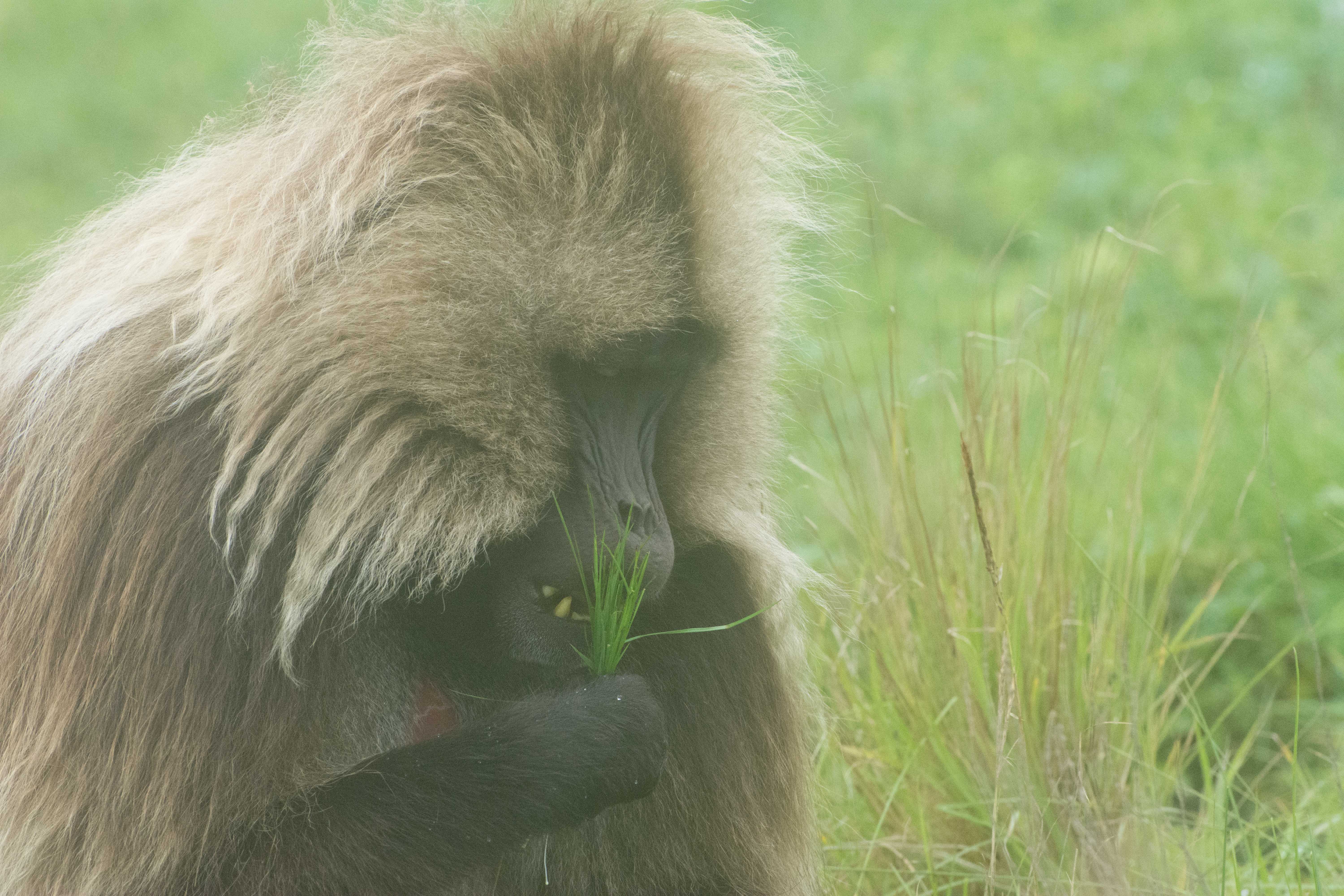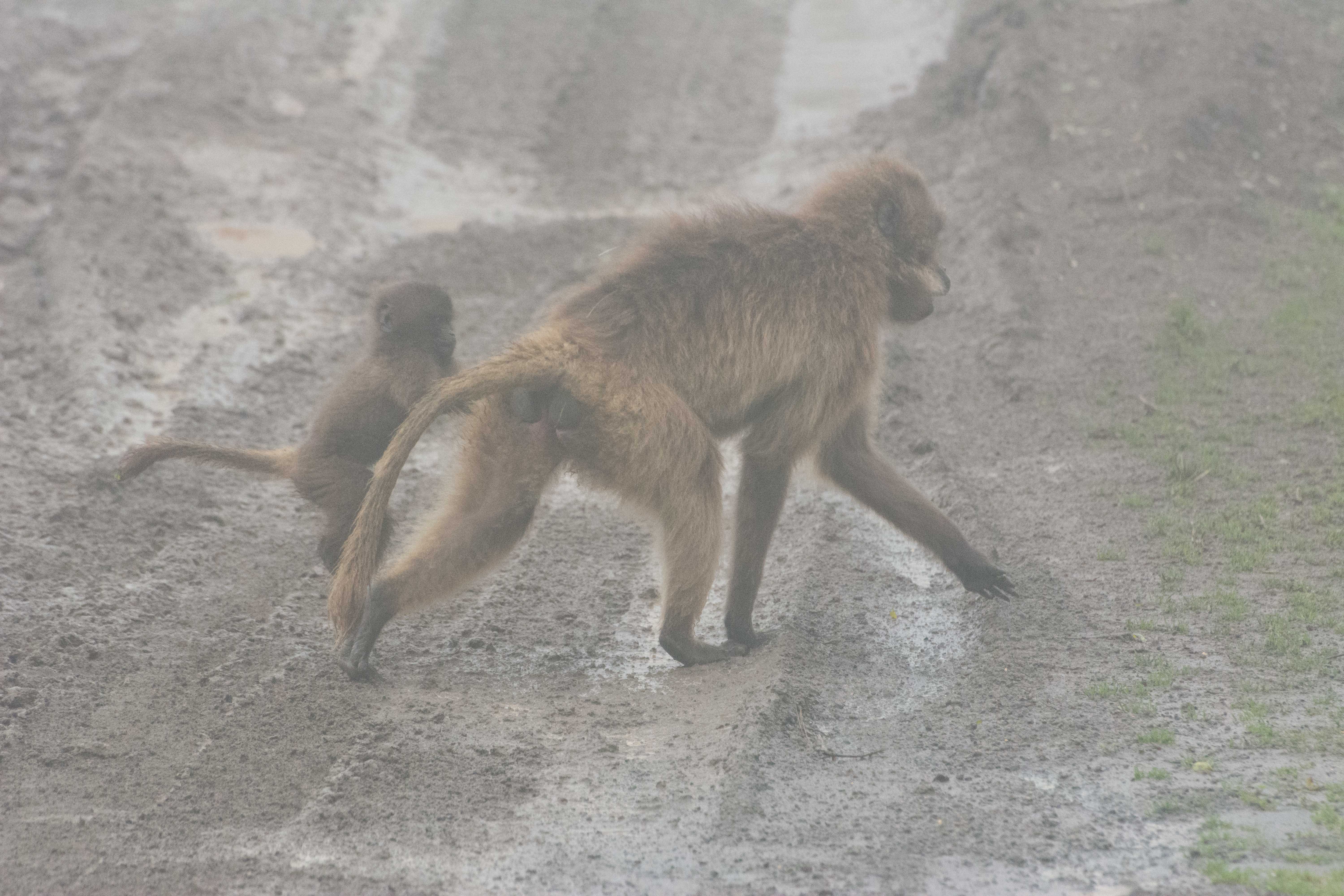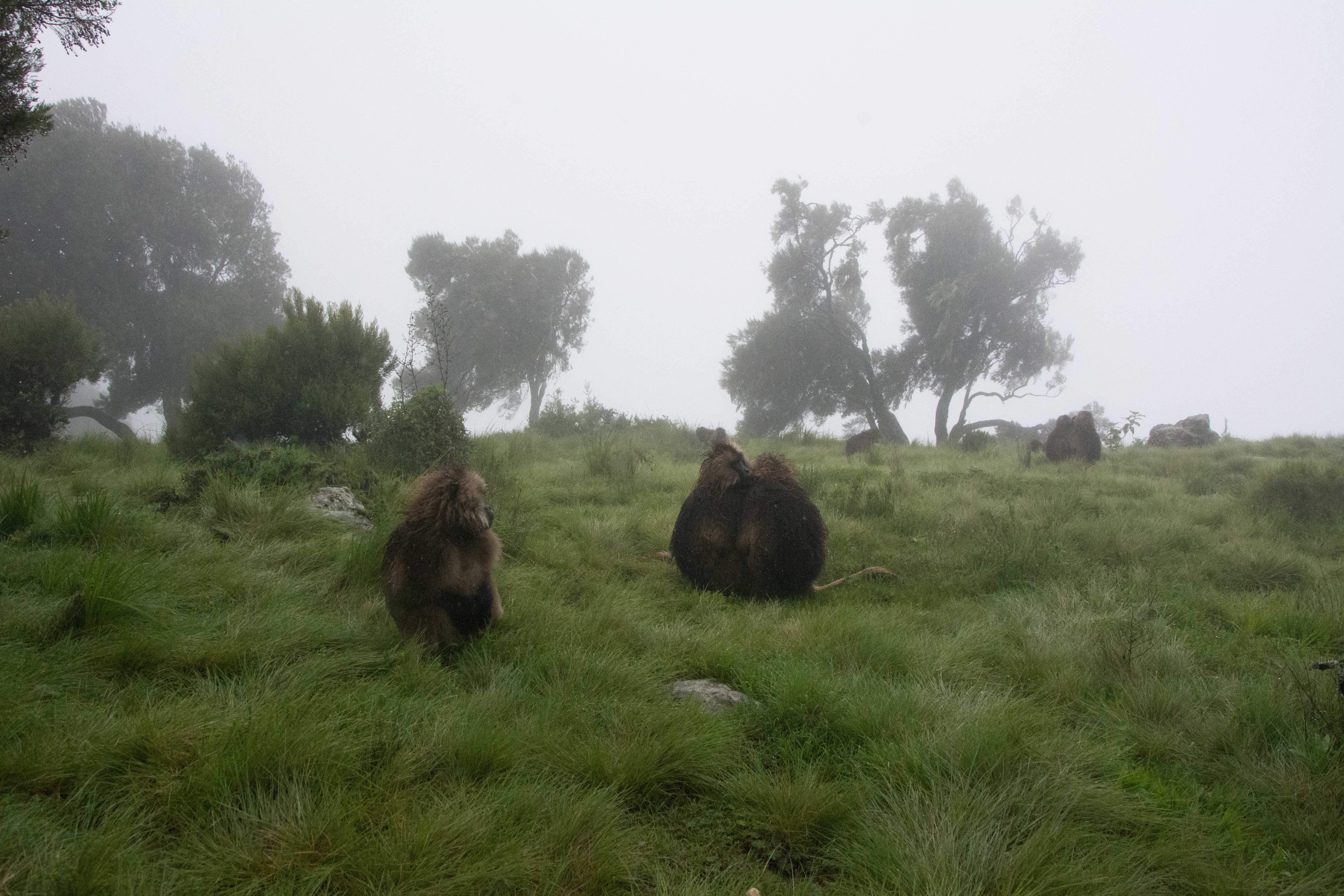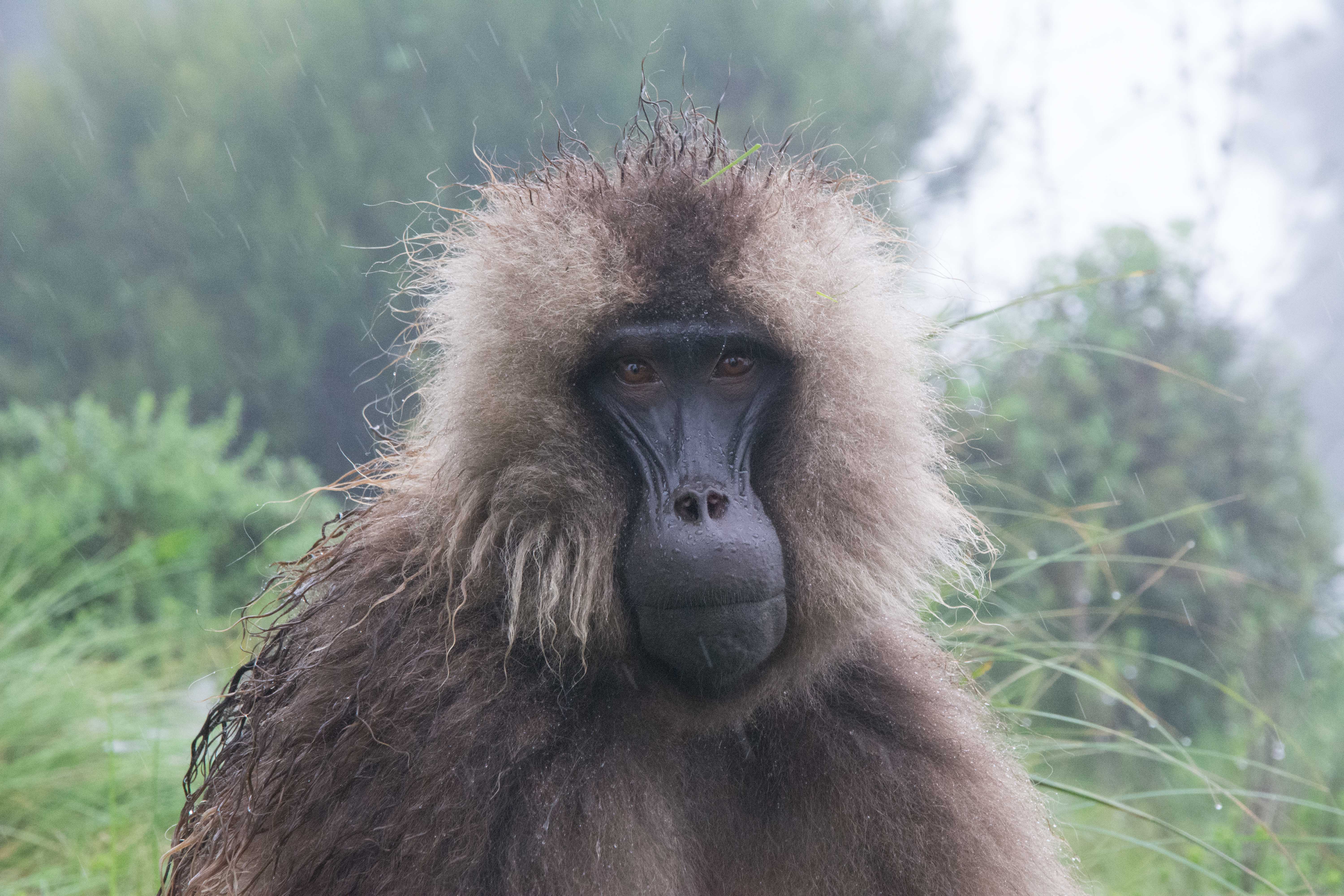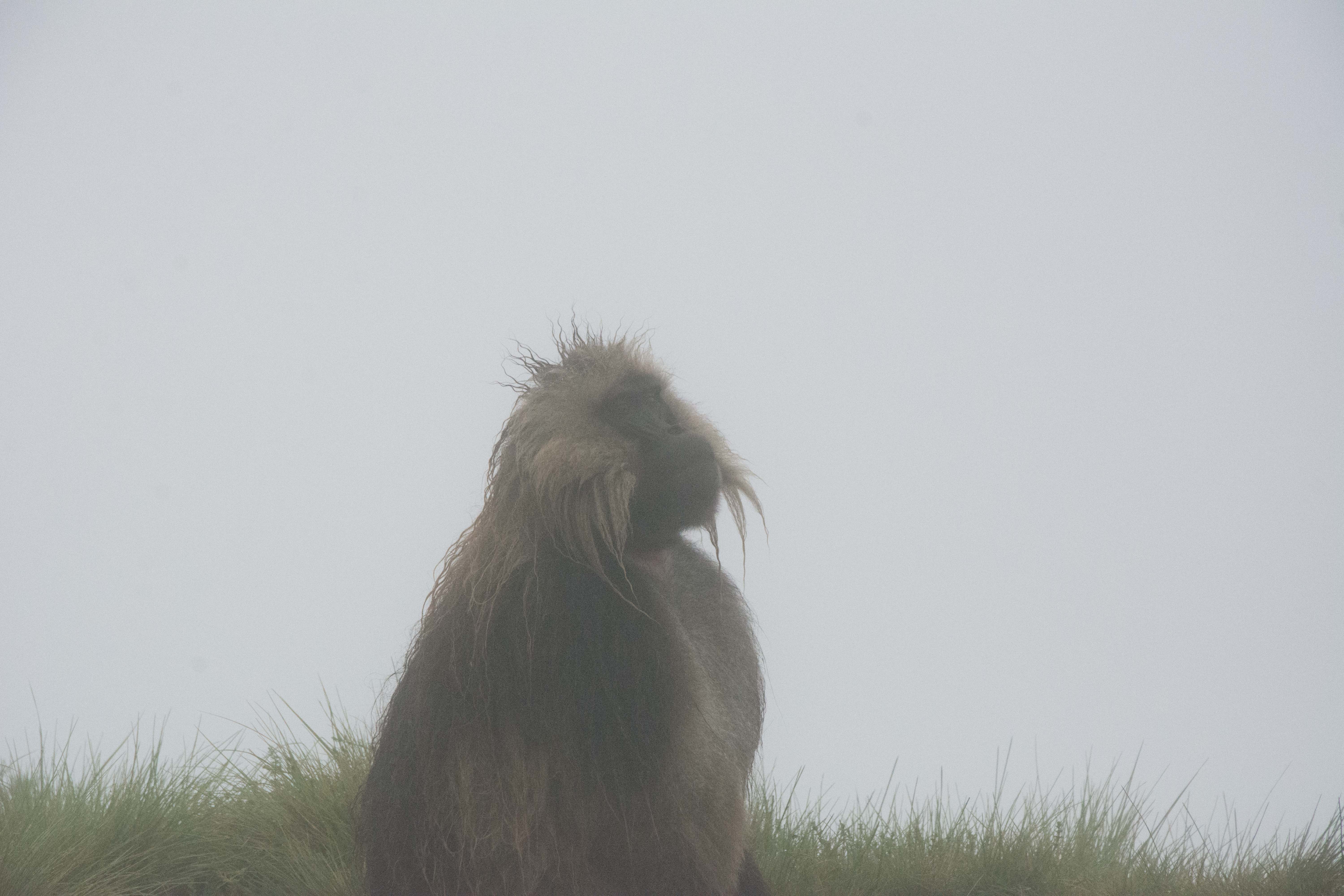 Way up in the Ethiopian Highlands past the famous city of Gondor lies mountains like no other.  The Simien Mountains with its misty fog and rain are some of the biggest mountain ranges on the African Continent.  While I wish the weather was a lot better here, you can never deal with Mother Nature.  While many people come here for the hikes and the beautiful water fall views, I came here to see the famous Gelada Baboons.  These Baboons are found only in a certain part of these mountains and are the last of the grazing baboons left in the world today.  Commonly called the Bleeding Heart Baboons because of the heart on their chest, they have a wide range of facial expressions and vocalizations which are second only to humans.  By day the graze upon the grass of the high mountain plains in troops and by night to stay away from predators they sleep on the rocky cliffs below.  While it rained and was foggy most of the time up here, I did get close enough to see how they function as a troop.  Most of the trekking was done in rain and fog and wind, but when the rain cleared we also got a beautiful look at the stunning scenery of the waterfalls and landscape.  You can see below what I mean….