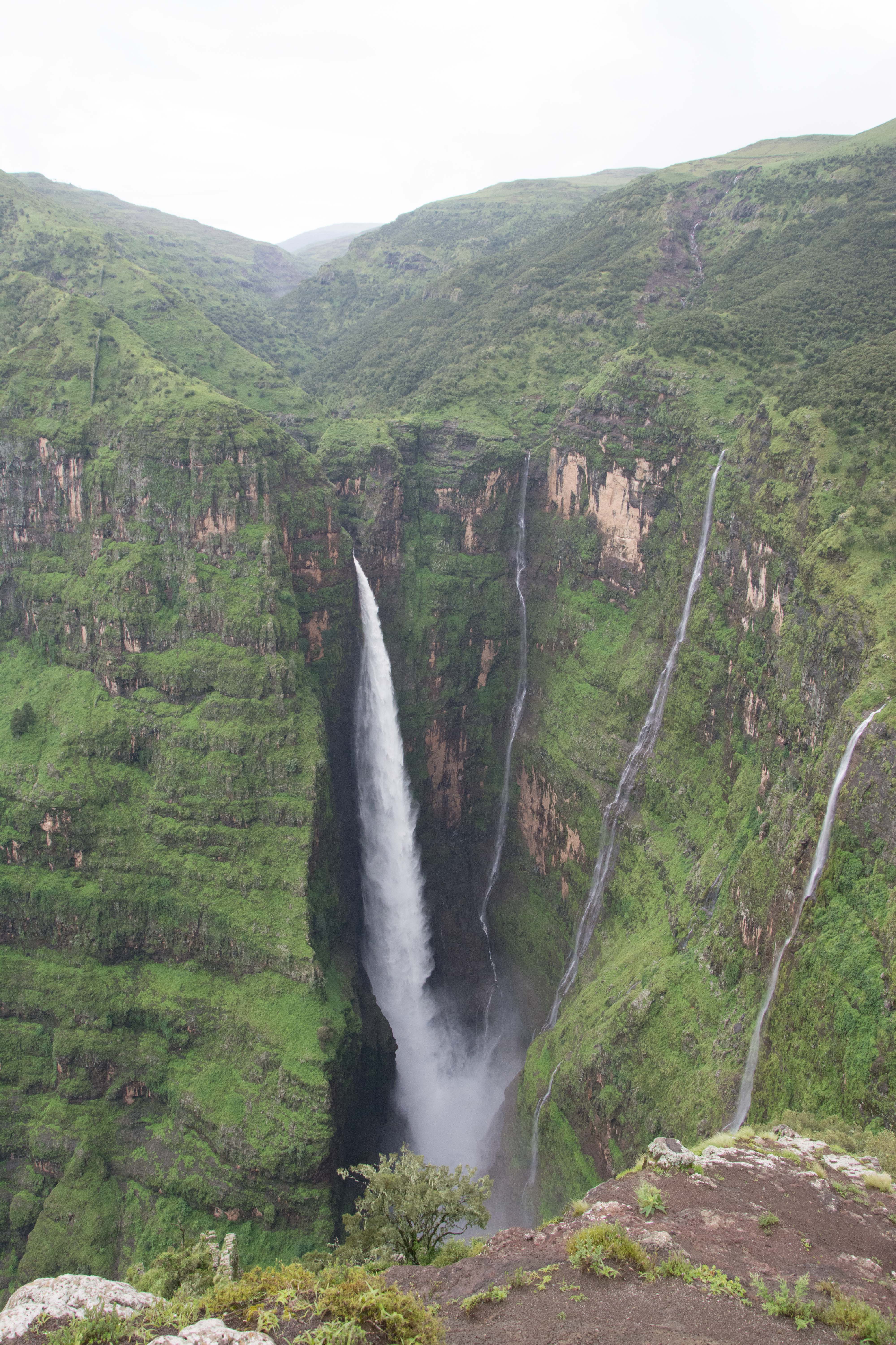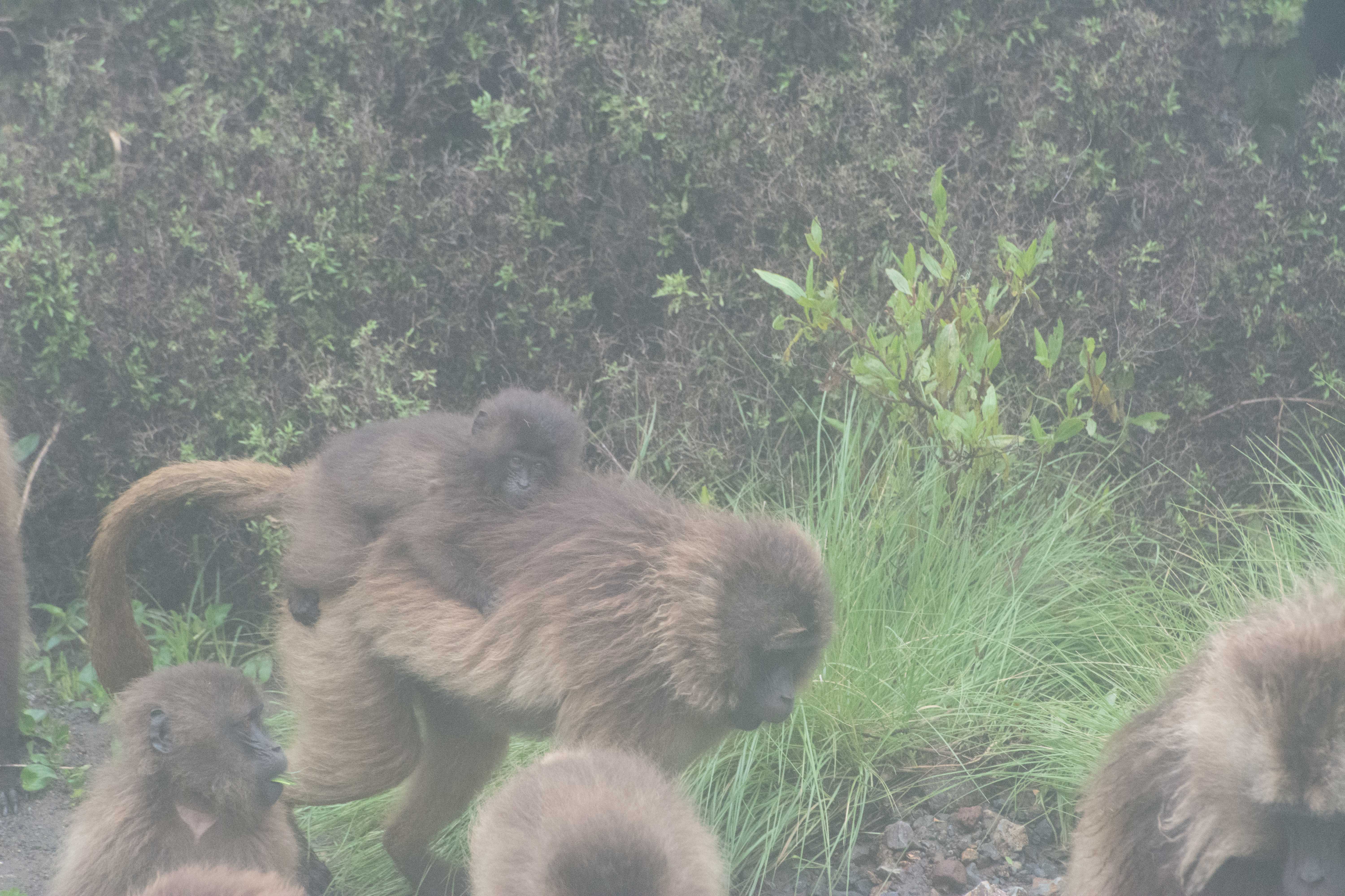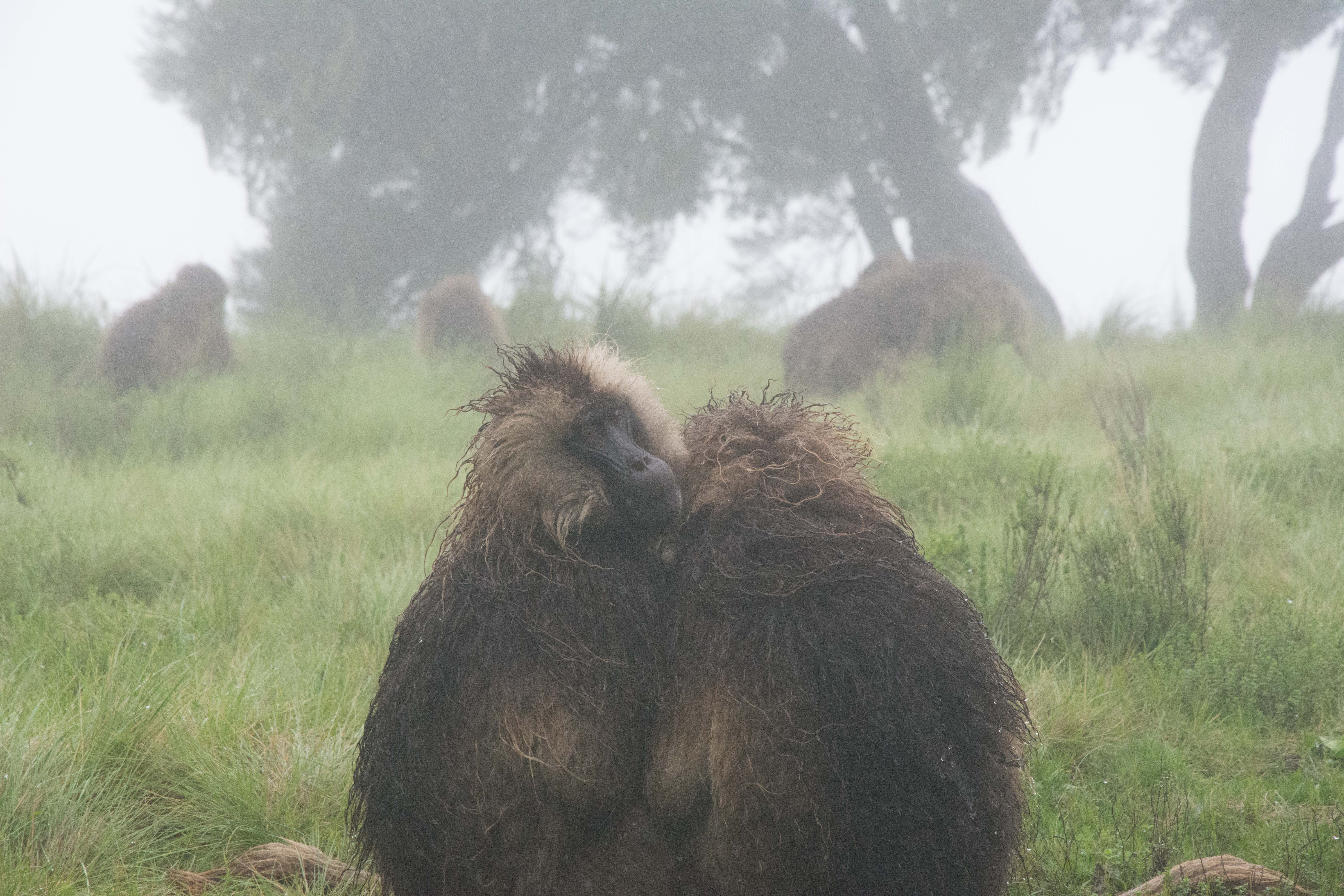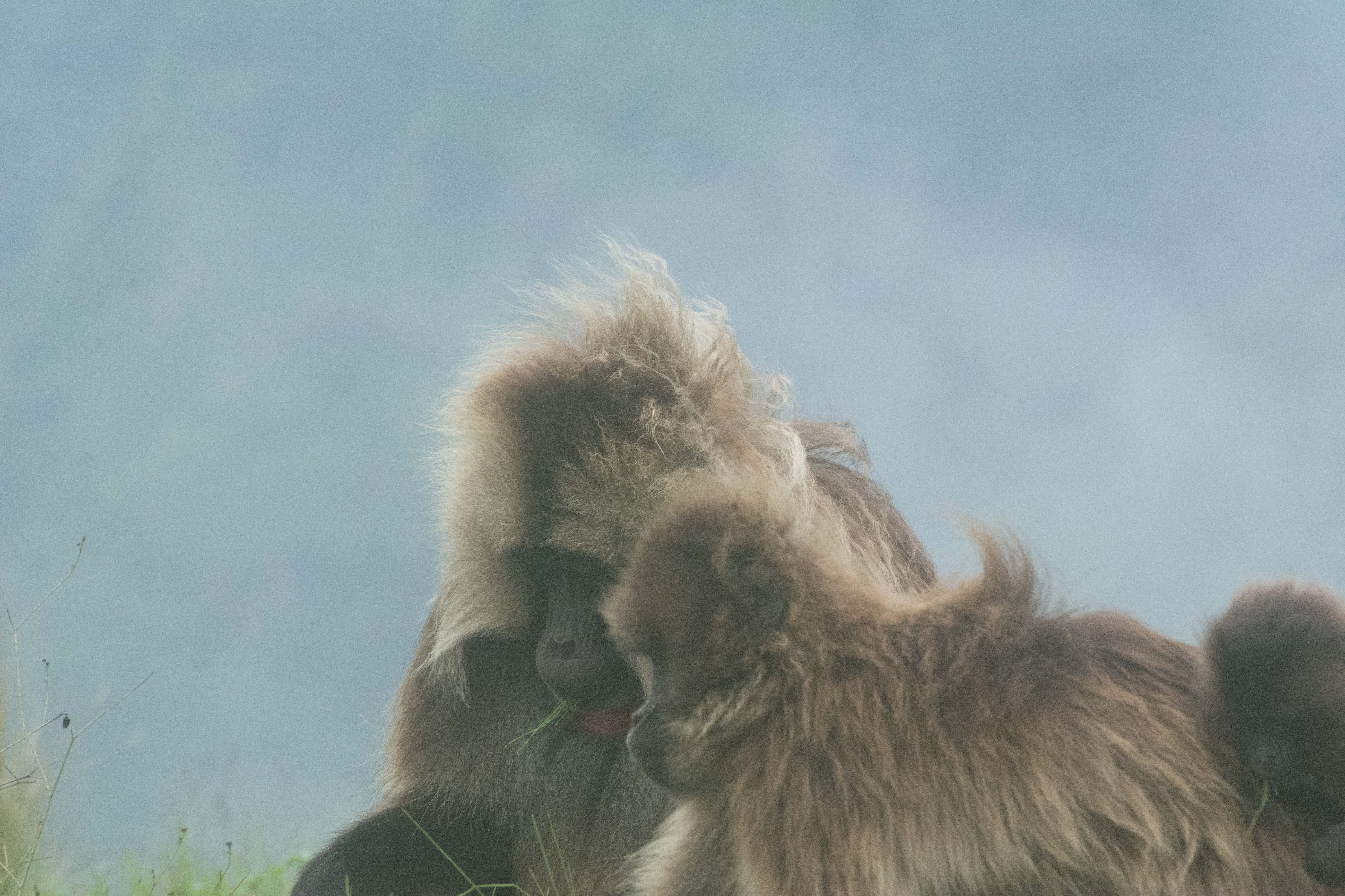 Way up in the Ethiopian Highlands past the famous city of Gondor lies mountains like no other.  The Simien Mountains with its misty fog and rain are some of the biggest mountain ranges on the African Continent.  While I wish the weather was a lot better here, you can never deal with Mother Nature.  While many people come here for the hikes and the beautiful water fall views, I came here to see the famous Gelada Baboons.  These Baboons are found only in a certain part of these mountains and are the last of the grazing baboons left in the world today.  Commonly called the Bleeding Heart Baboons because of the heart on their chest, they have a wide range of facial expressions and vocalizations which are second only to humans.  By day the graze upon the grass of the high mountain plains in troops and by night to stay away from predators they sleep on the rocky cliffs below.  While it rained and was foggy most of the time up here, I did get close enough to see how they function as a troop.  Most of the trekking was done in rain and fog and wind, but when the rain cleared we also got a beautiful look at the stunning scenery of the waterfalls and landscape.  You can see below what I mean….
