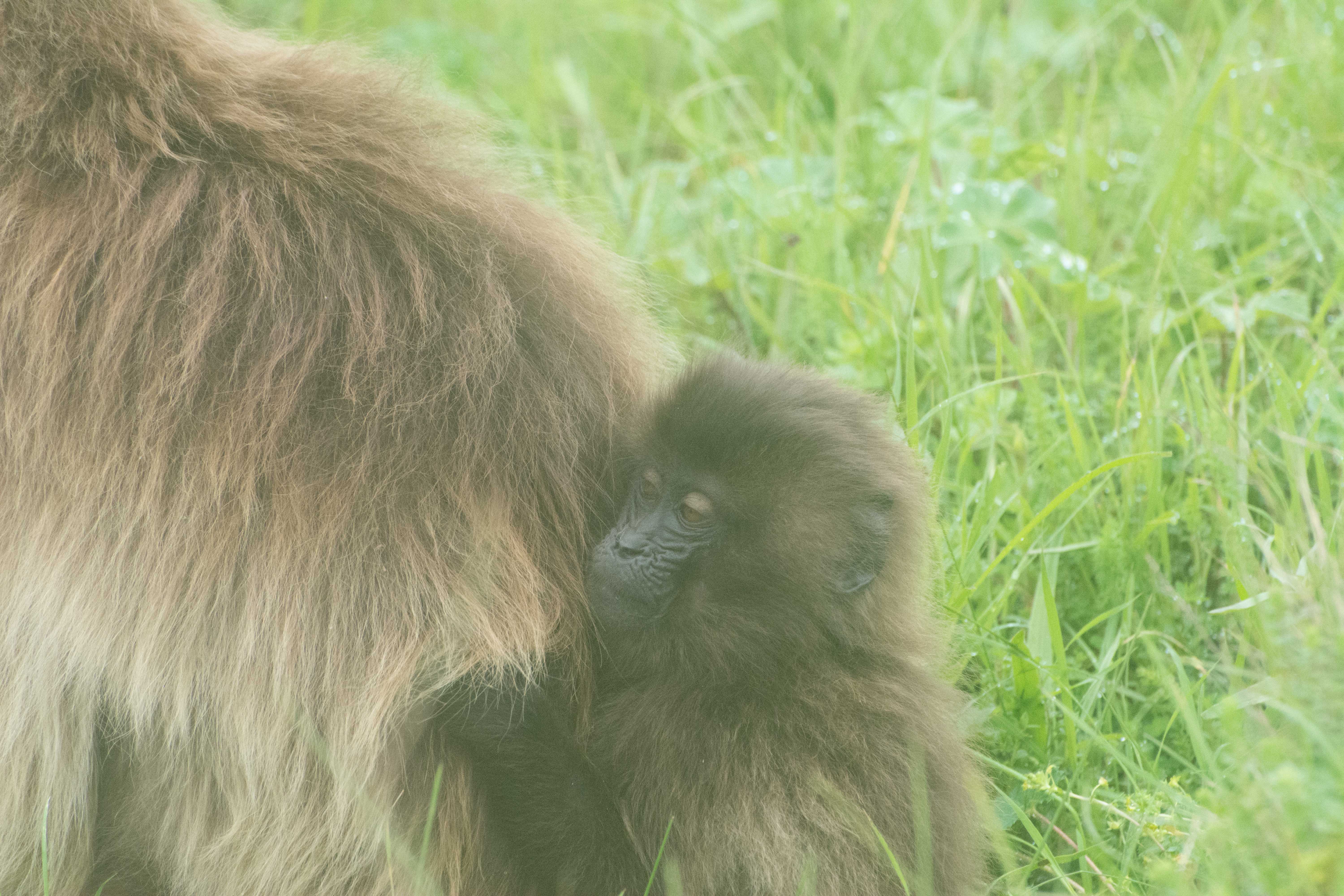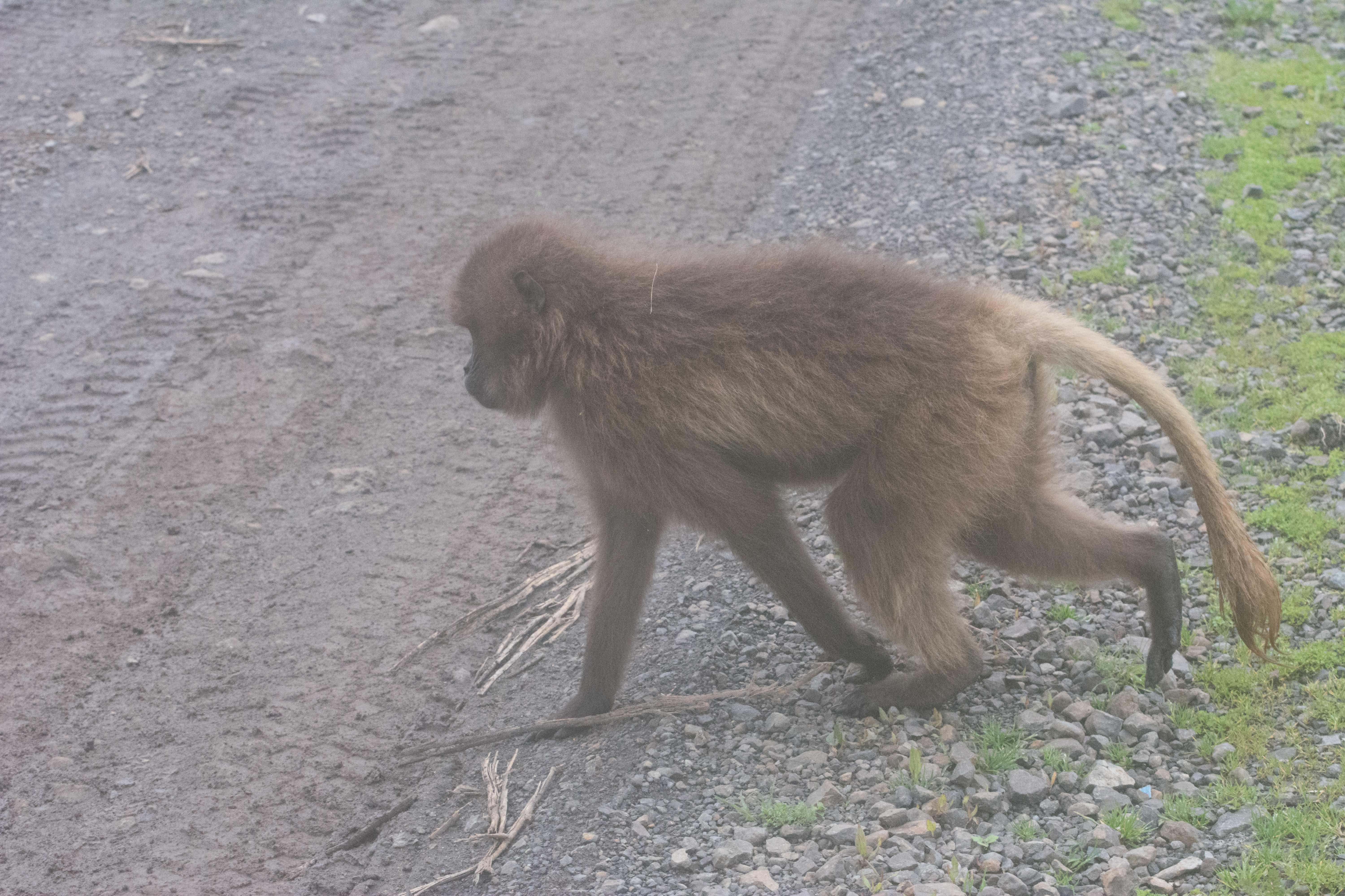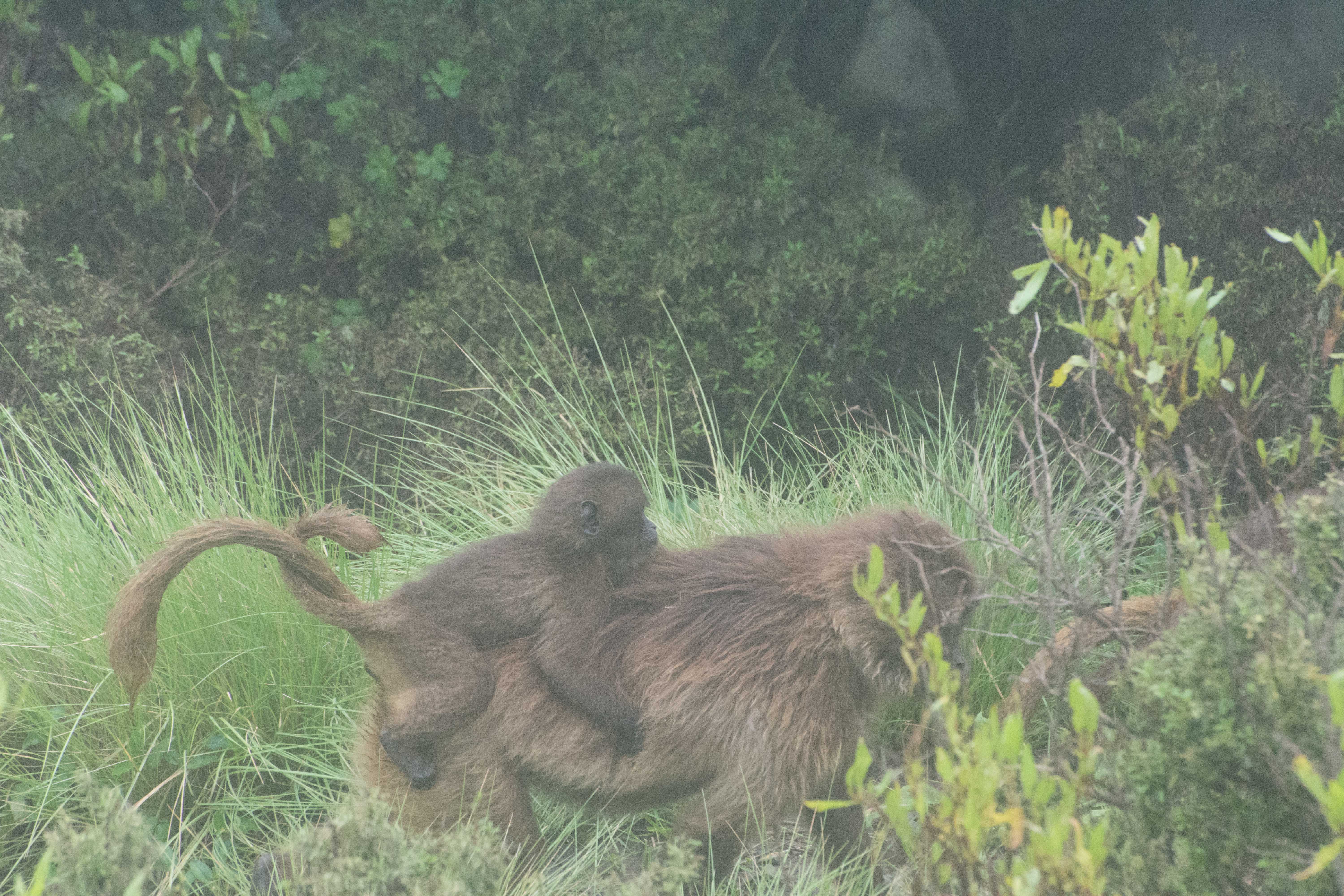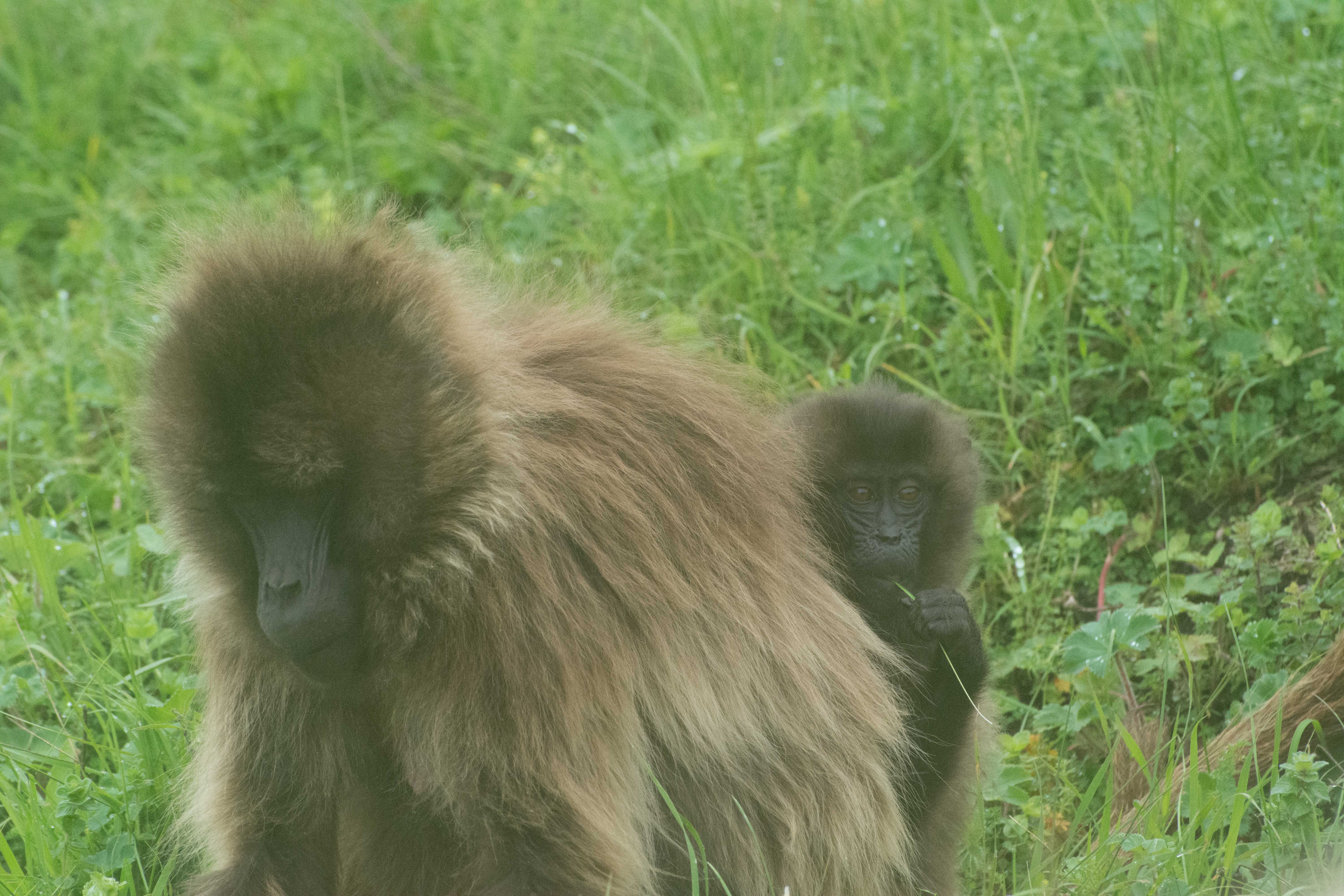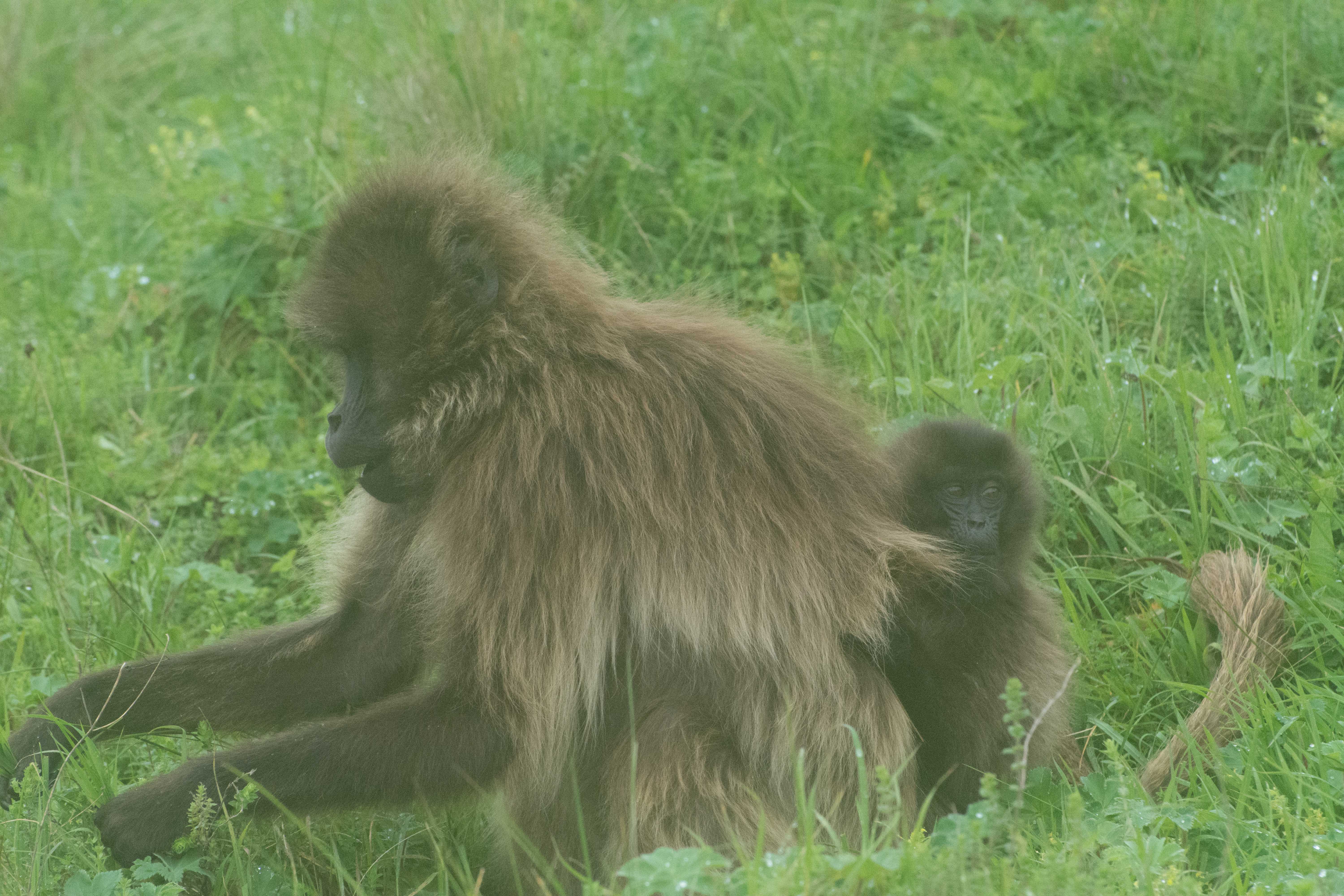 Way up in the Ethiopian Highlands past the famous city of Gondor lies mountains like no other.  The Simien Mountains with its misty fog and rain are some of the biggest mountain ranges on the African Continent.  While I wish the weather was a lot better here, you can never deal with Mother Nature.  While many people come here for the hikes and the beautiful water fall views, I came here to see the famous Gelada Baboons.  These Baboons are found only in a certain part of these mountains and are the last of the grazing baboons left in the world today.  Commonly called the Bleeding Heart Baboons because of the heart on their chest, they have a wide range of facial expressions and vocalizations which are second only to humans.  By day the graze upon the grass of the high mountain plains in troops and by night to stay away from predators they sleep on the rocky cliffs below.  While it rained and was foggy most of the time up here, I did get close enough to see how they function as a troop.  Most of the trekking was done in rain and fog and wind, but when the rain cleared we also got a beautiful look at the stunning scenery of the waterfalls and landscape.  You can see below what I mean….