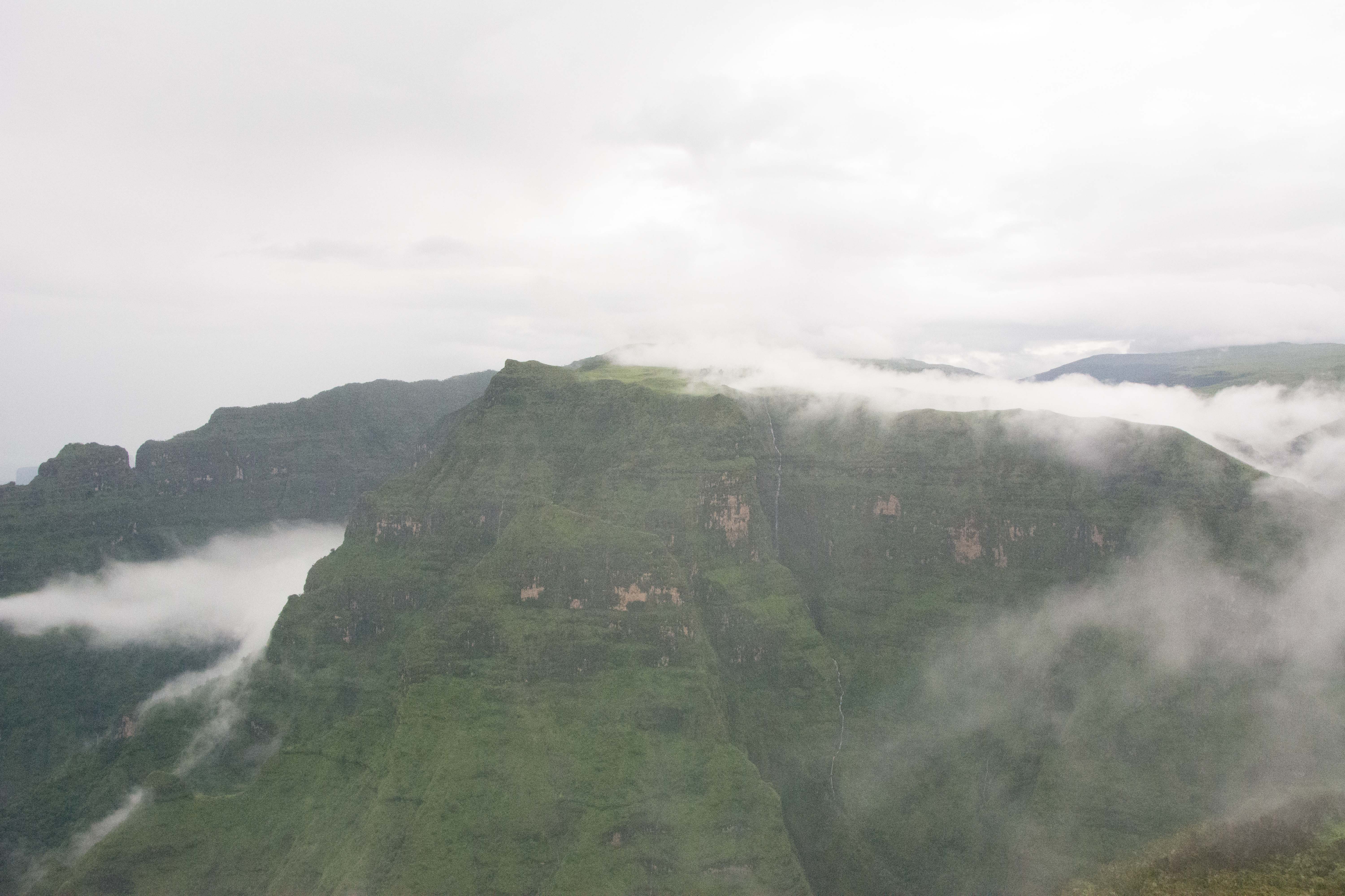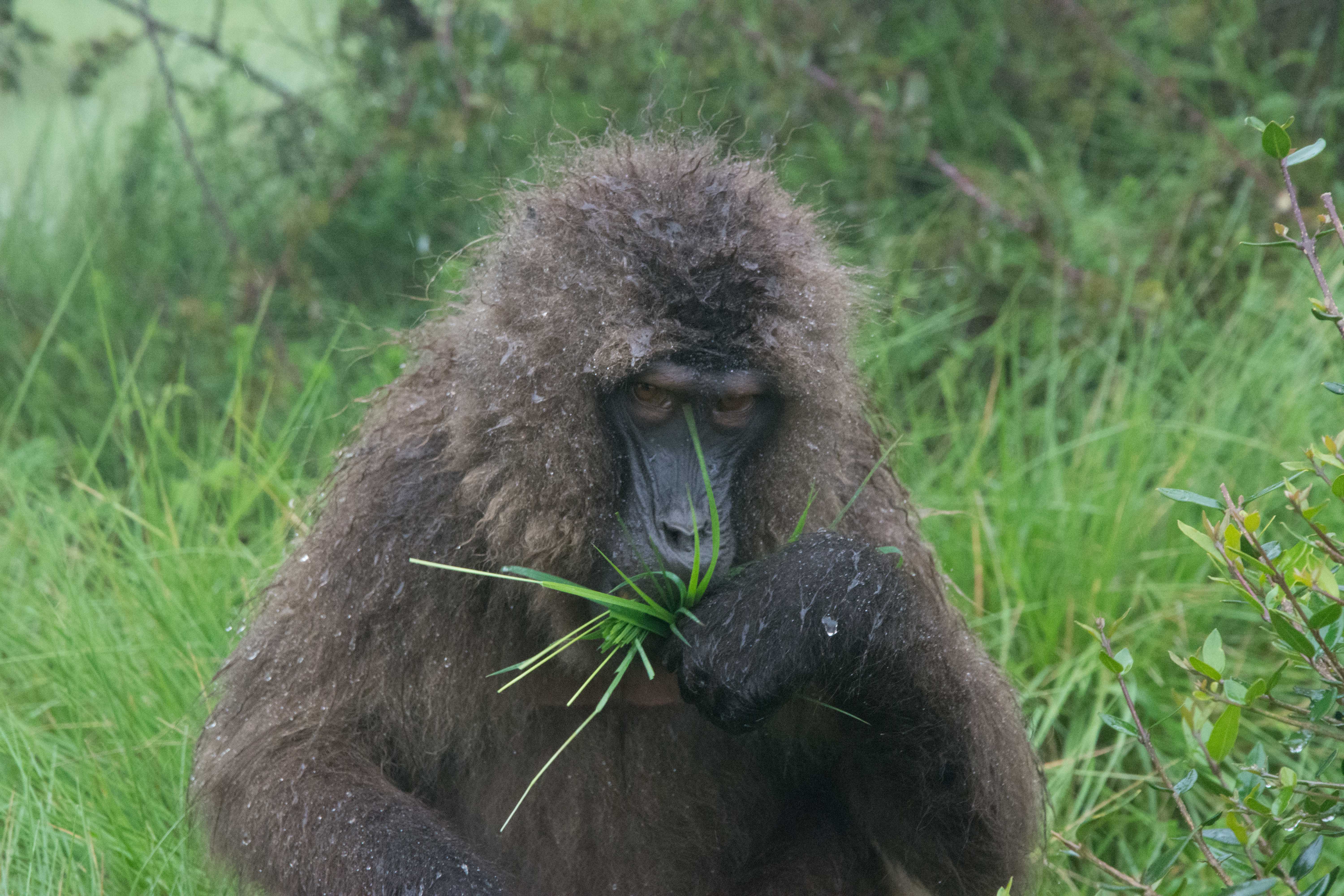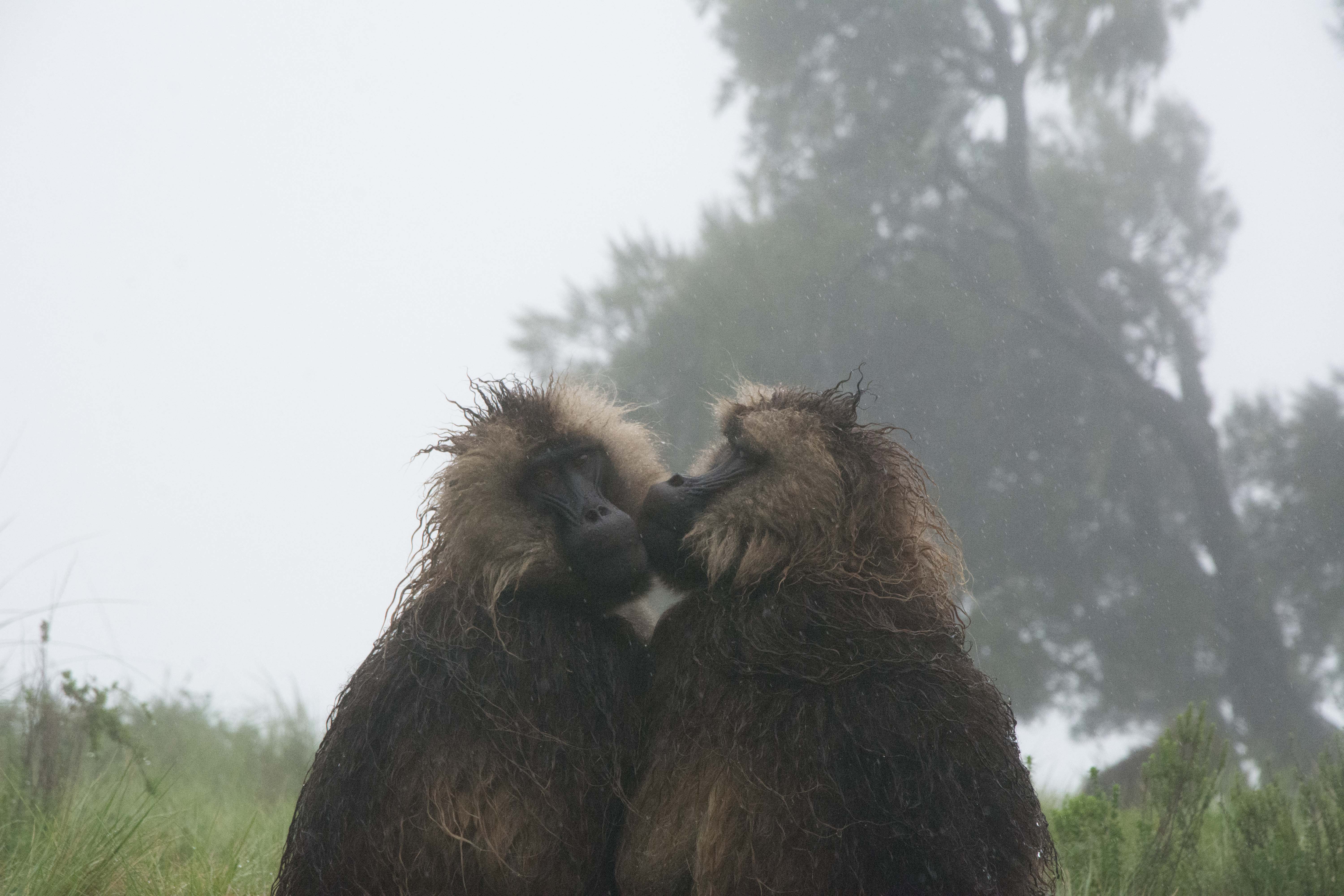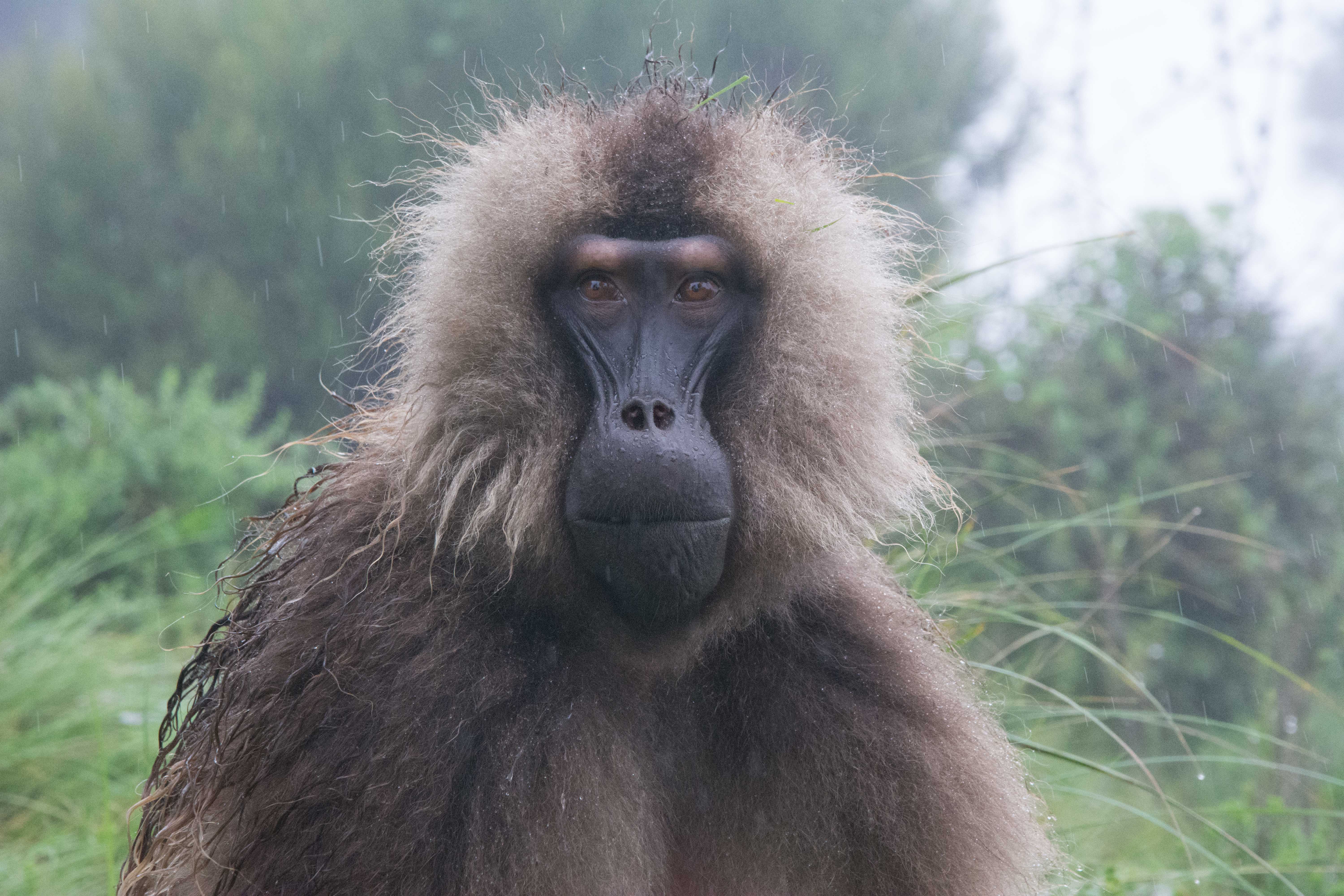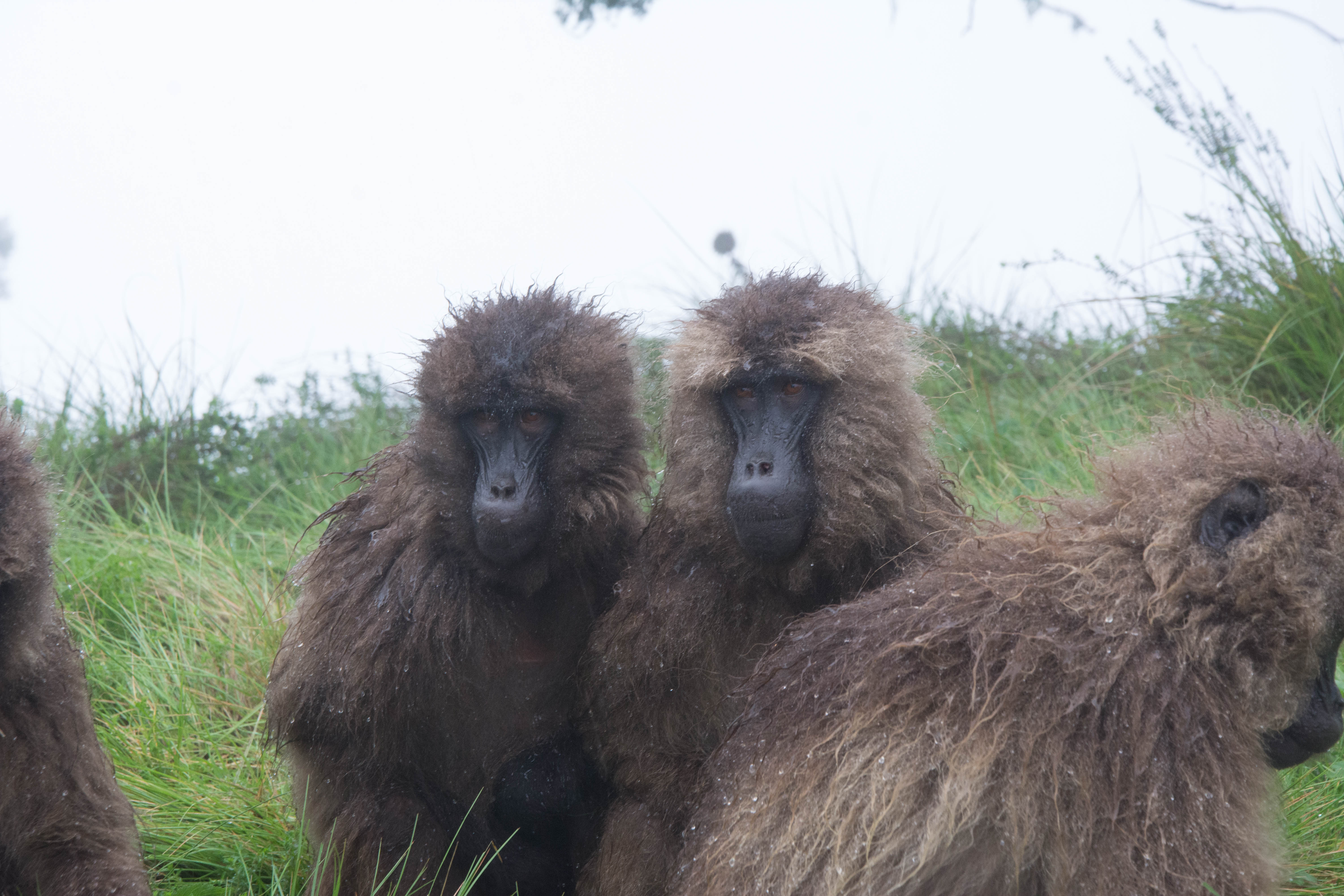 Way up in the Ethiopian Highlands past the famous city of Gondor lies mountains like no other.  The Simien Mountains with its misty fog and rain are some of the biggest mountain ranges on the African Continent.  While I wish the weather was a lot better here, you can never deal with Mother Nature.  While many people come here for the hikes and the beautiful water fall views, I came here to see the famous Gelada Baboons.  These Baboons are found only in a certain part of these mountains and are the last of the grazing baboons left in the world today.  Commonly called the Bleeding Heart Baboons because of the heart on their chest, they have a wide range of facial expressions and vocalizations which are second only to humans.  By day the graze upon the grass of the high mountain plains in troops and by night to stay away from predators they sleep on the rocky cliffs below.  While it rained and was foggy most of the time up here, I did get close enough to see how they function as a troop.  Most of the trekking was done in rain and fog and wind, but when the rain cleared we also got a beautiful look at the stunning scenery of the waterfalls and landscape.  You can see below what I mean….