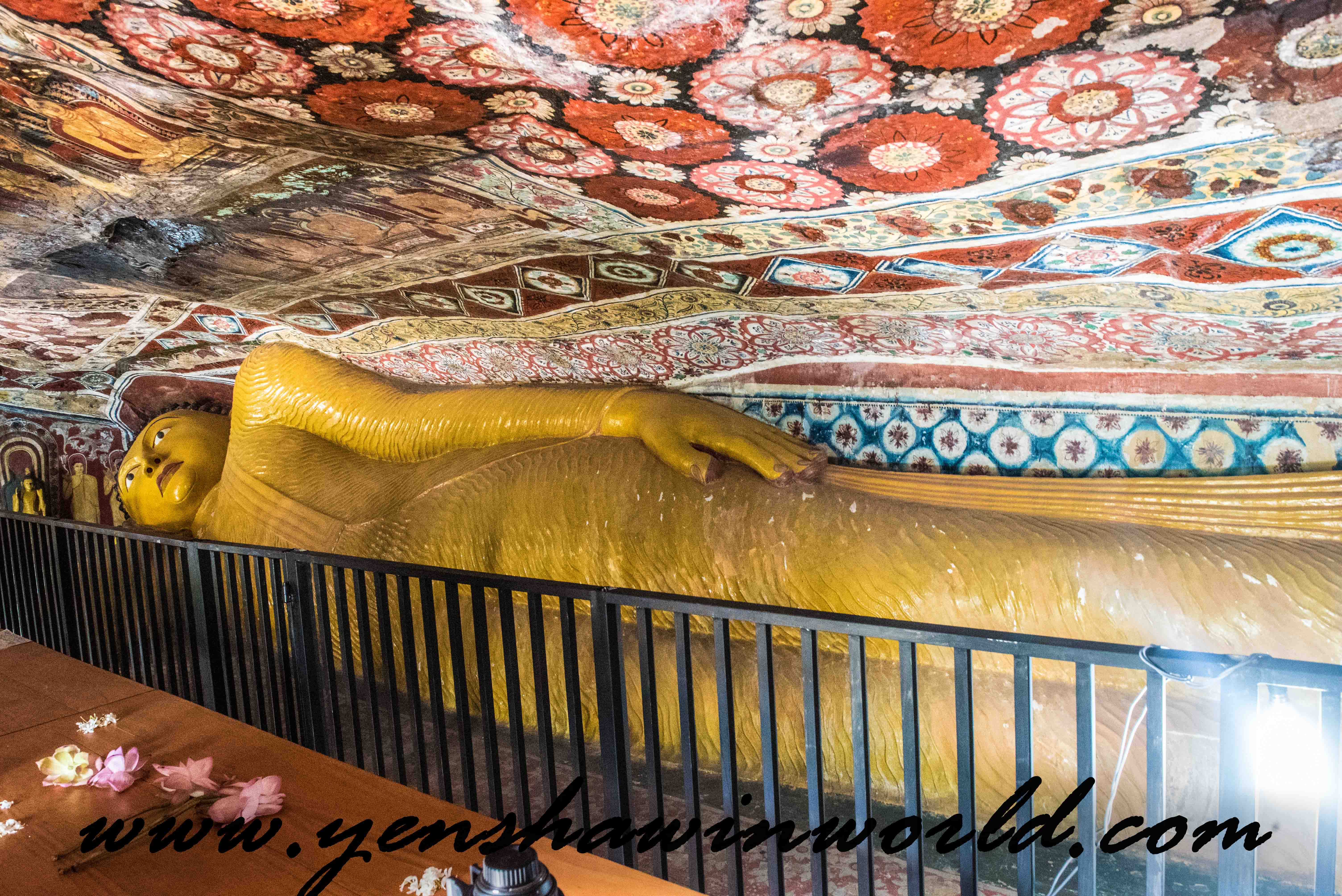 The temple itself is an ancient Buddhist Temple. It has been built on a 675 foot natural high rock, surrounded with another four rocks. It has numerous paintings inside on the walls and of course laying Buddha statues in the different parts. On the top of the rock is a beautiful little Buddhist shrine with a Priest that blesses you and it has a great panorama view of the entire area with the endless jungles.